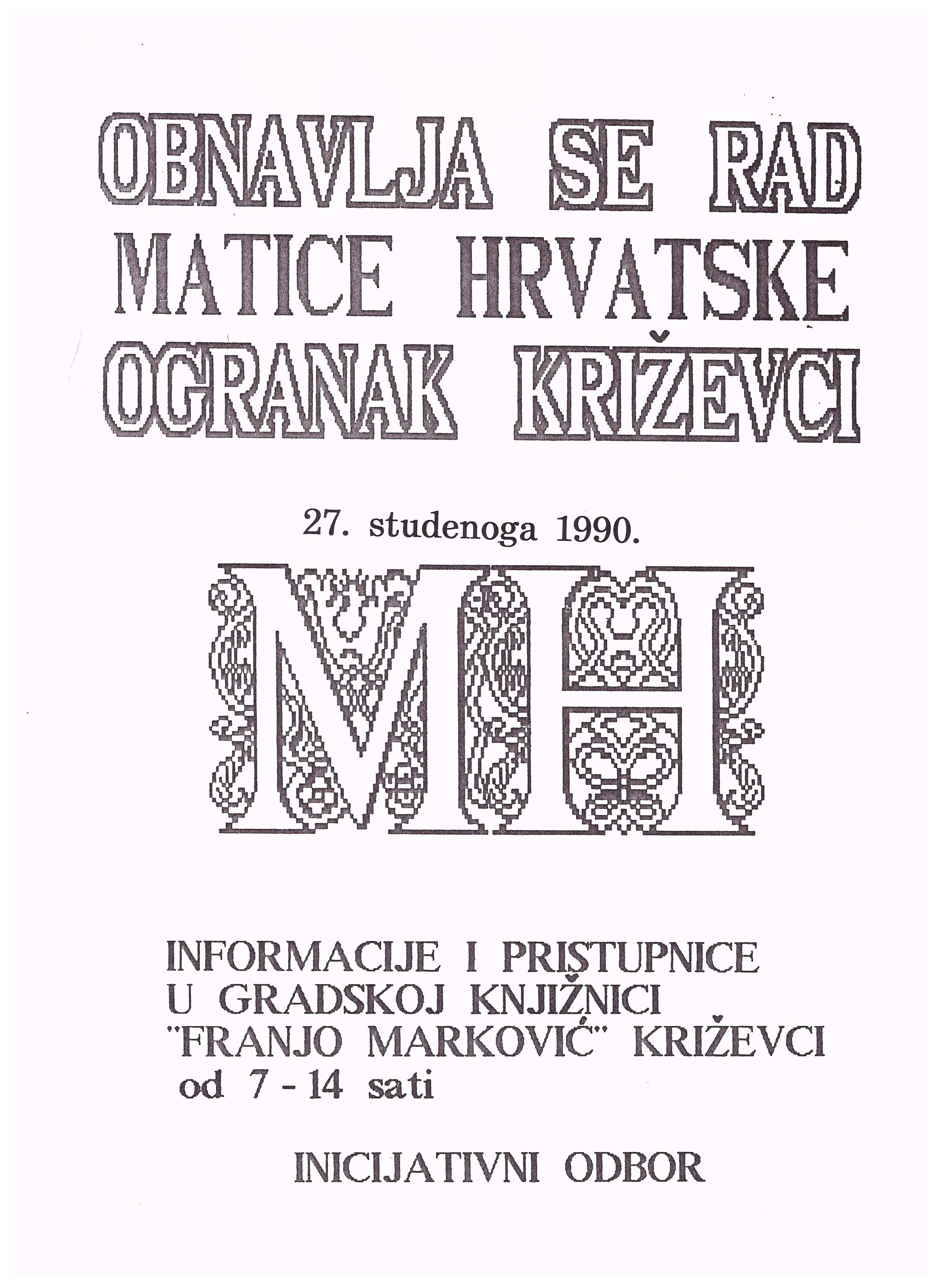 Dana 26. listopada 1990. pokrenuta je inicijativa za osnivanje, tj. obnovu rada i djelovanja Ogranka Matice hrvatske Križevci u svrhu kulturno-prosvjetnog djelovanja na području Općine Križevci. Komitet za društvene djelatnosti Općine Križevci imenovao je u inicijativni odbor sljedeće članove: Vladimir Srimšek, Petar Delić, Lijerka Končurat, Branko Tinodi, Nikola Žulj, Zoran Homen, Stjepan Palijan, Željko Husinec, Ivana Trakoštanec-Sušec, Slavko Balog.