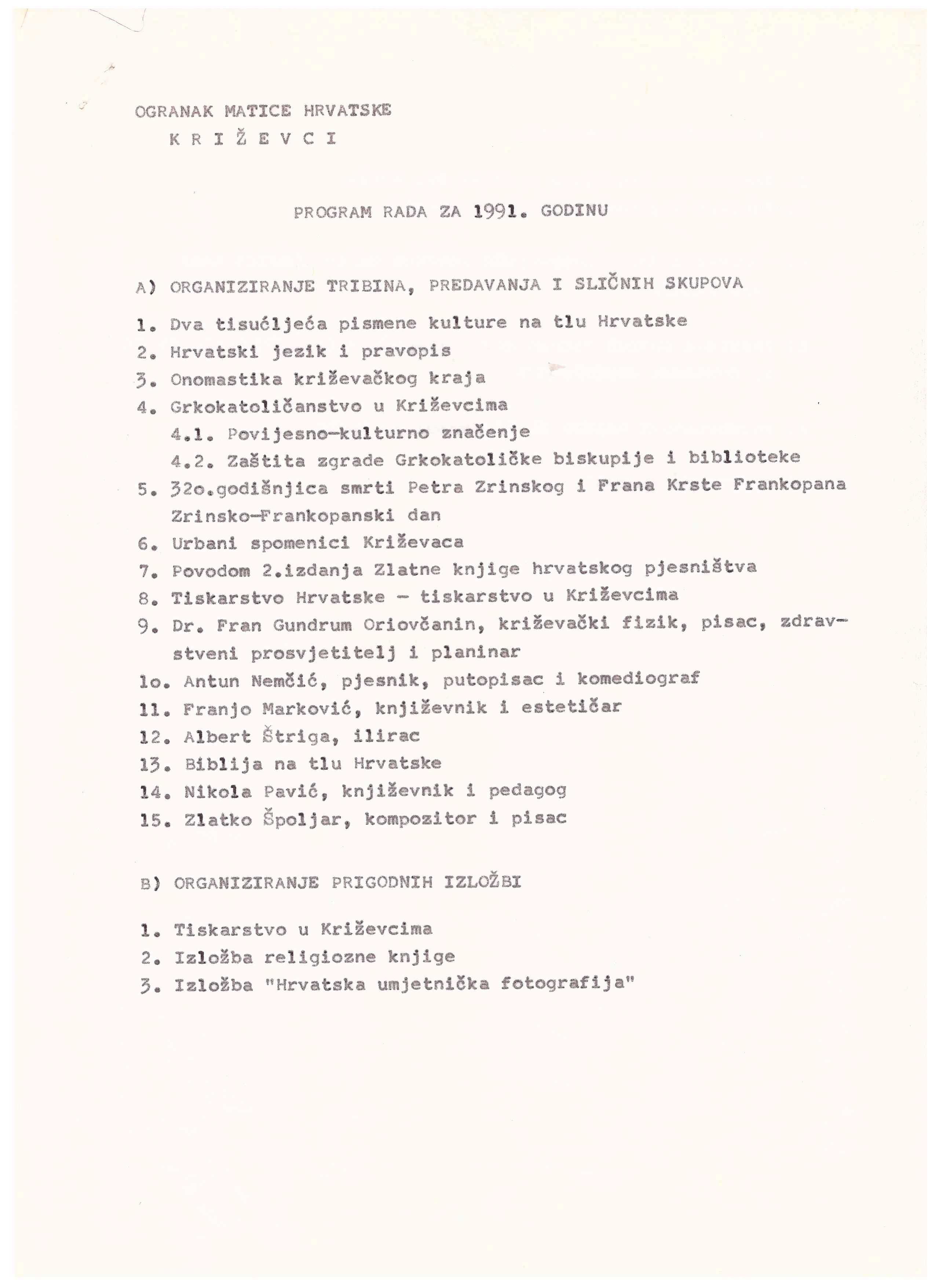 Obnoviteljska skupština odžana je 27. studenoga 1990. u 19 sati u maloj dvorani Doma kulture u Križevcima s ovim dnevnim redom: