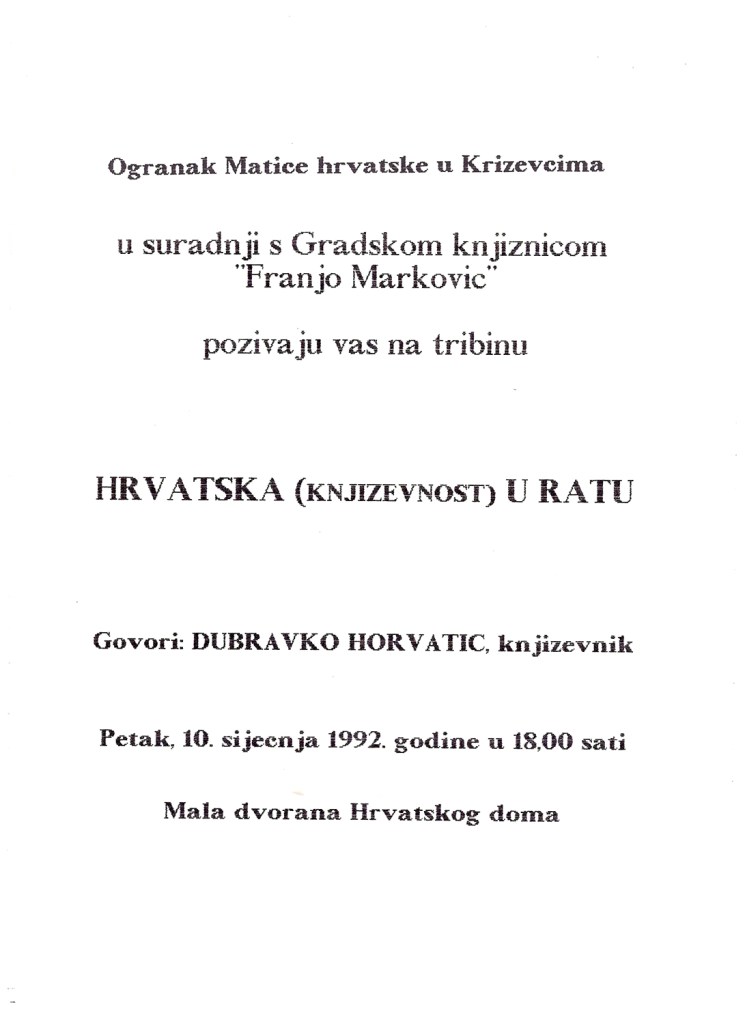Ogranak Matice hrvatske Križevci u suradnji s Gradskom knjižnicom „Franjo Marković” organizirao je 10. siječnja 1992. u maloj dvorani Hrvatskoga doma tribinu „Hrvatska (književnost) u ratu”. Gost tribine bio je književnik Dubravko Horvatić. Uz predavanje postavljena je i izložba knjiga Nakladnog zavoda MH i izložba fotodokumentacije o ratu u Hrvatskoj.