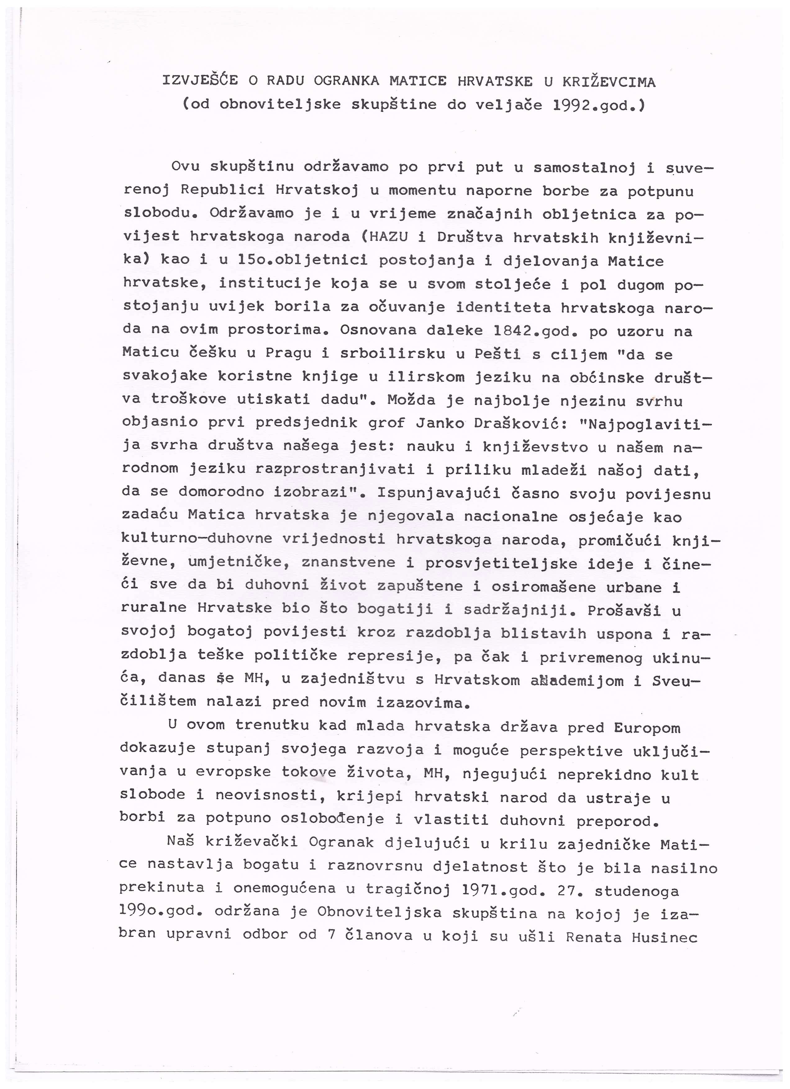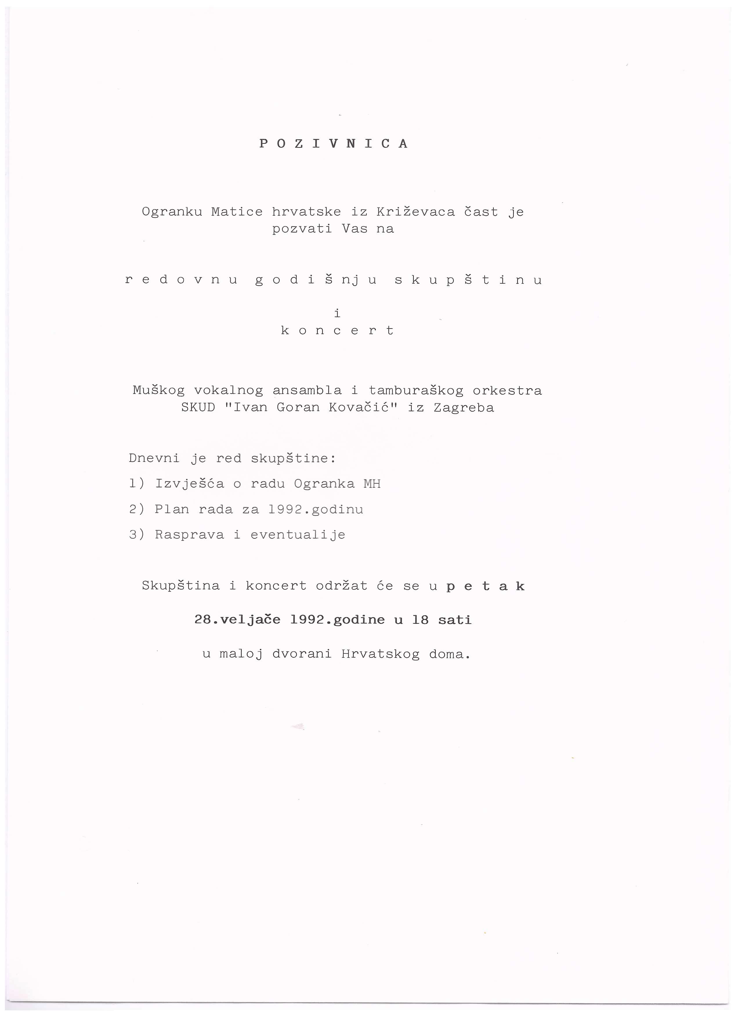 1992. / Skupštine i sjednice Redovna godišnja skupština 28/02/199227/12/2020 martinarebic Ogranak Matice hrvatske u Križevcima održao je 28. veljače 1992. u maloj dvorani Hrvatskoga doma redovnu godišnju skupštinu. Uz skupštinu održan je i koncert Muškog vokalnog ansambla i tamburaškog orkestra SKUD „Ivan Goran Kovačić” iz Zagreba. Podjeli ovo: Click to share on X(Otvara se u novom prozoru) X Klikom podijelite na Facebooku(Otvara se u novom prozoru) Facebook Lajk Učitavanje...
