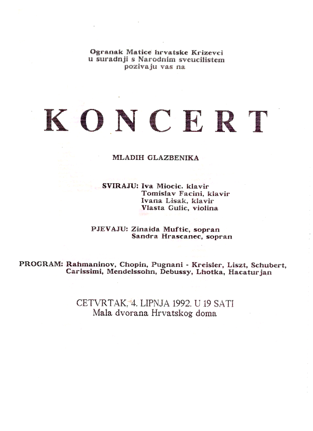 1992. / Koncerti Koncert mladih glazbenika 04/06/199227/12/2020 martinarebic U sklopu Križevačkog velikog spravišča Ogranak Matice hrvatske u Križevcima u suradnji s Narodnim sveučilištem organizirao je 4. lipnja 1992. u maloj dvorani Hrvatskoga doma koncert mladih glazbenika Glazbene škole „Vatroslav Lisinski” iz Zagreba. Podjeli ovo: Share on X(Otvara se u novom prozoru) X Podijeli na Facebooku (Otvara se u novom prozoru) Facebook Lajk Učitavanje...