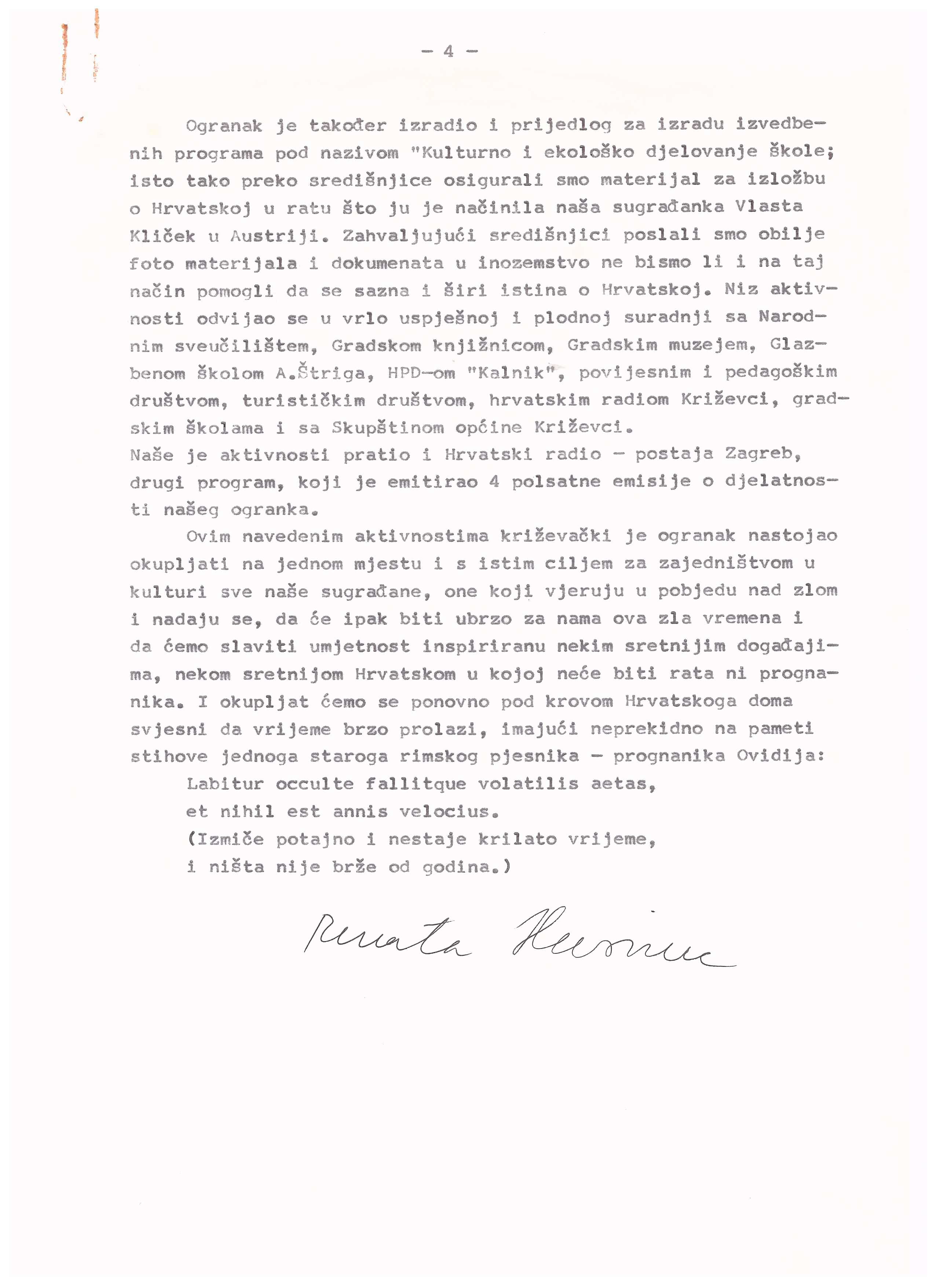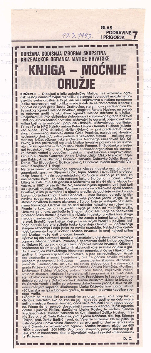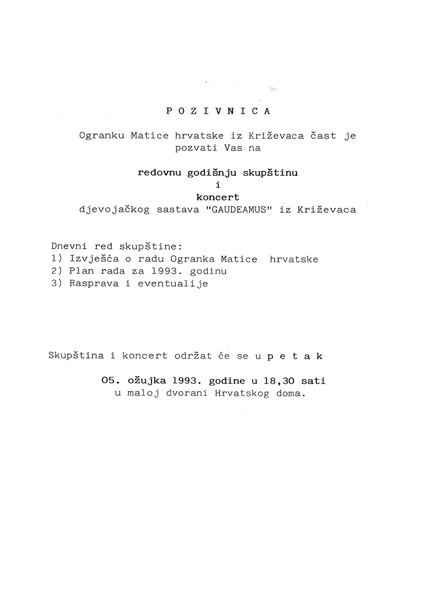 1993. / Godine / Skupštine i sjednice Redovna godišnja skupština 05/03/199329/12/2020 martinarebic Ogranak Matice hrvatske iz Križevaca održao je u petak, 5. ožujka 1993. u maloj dvorani Hrvatskoga doma redovnu godišnju skupštinu. Uz skupštinu održan je i koncert djevojačkog sastava Gaudeamus iz Križevaca. Podjeli ovo: Share on X(Otvara se u novom prozoru) X Podijeli na Facebooku (Otvara se u novom prozoru) Facebook Lajk Učitavanje...