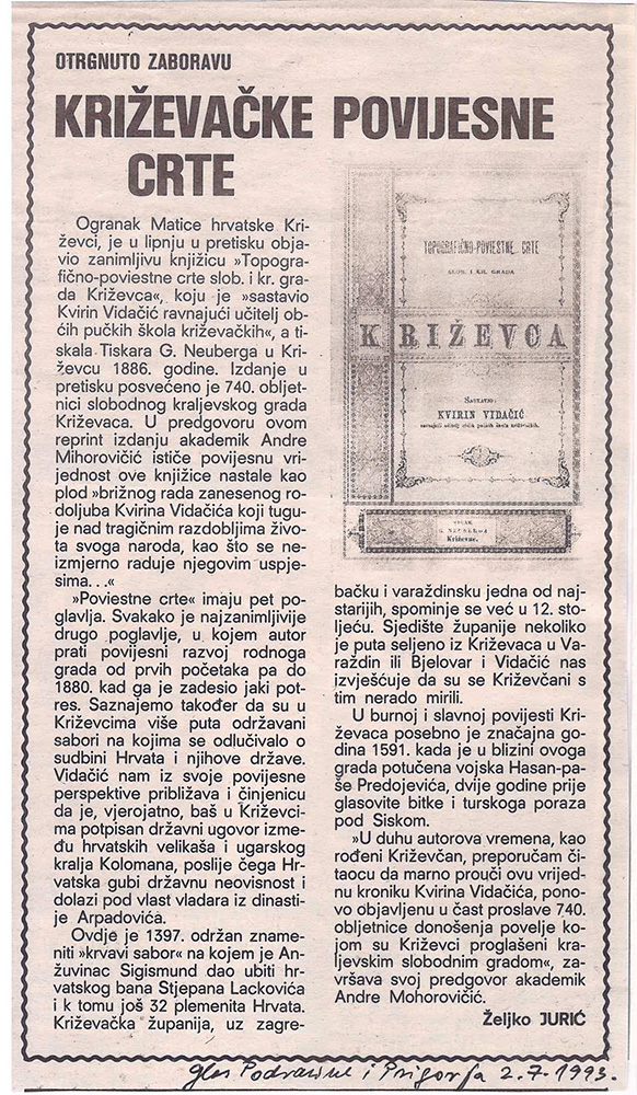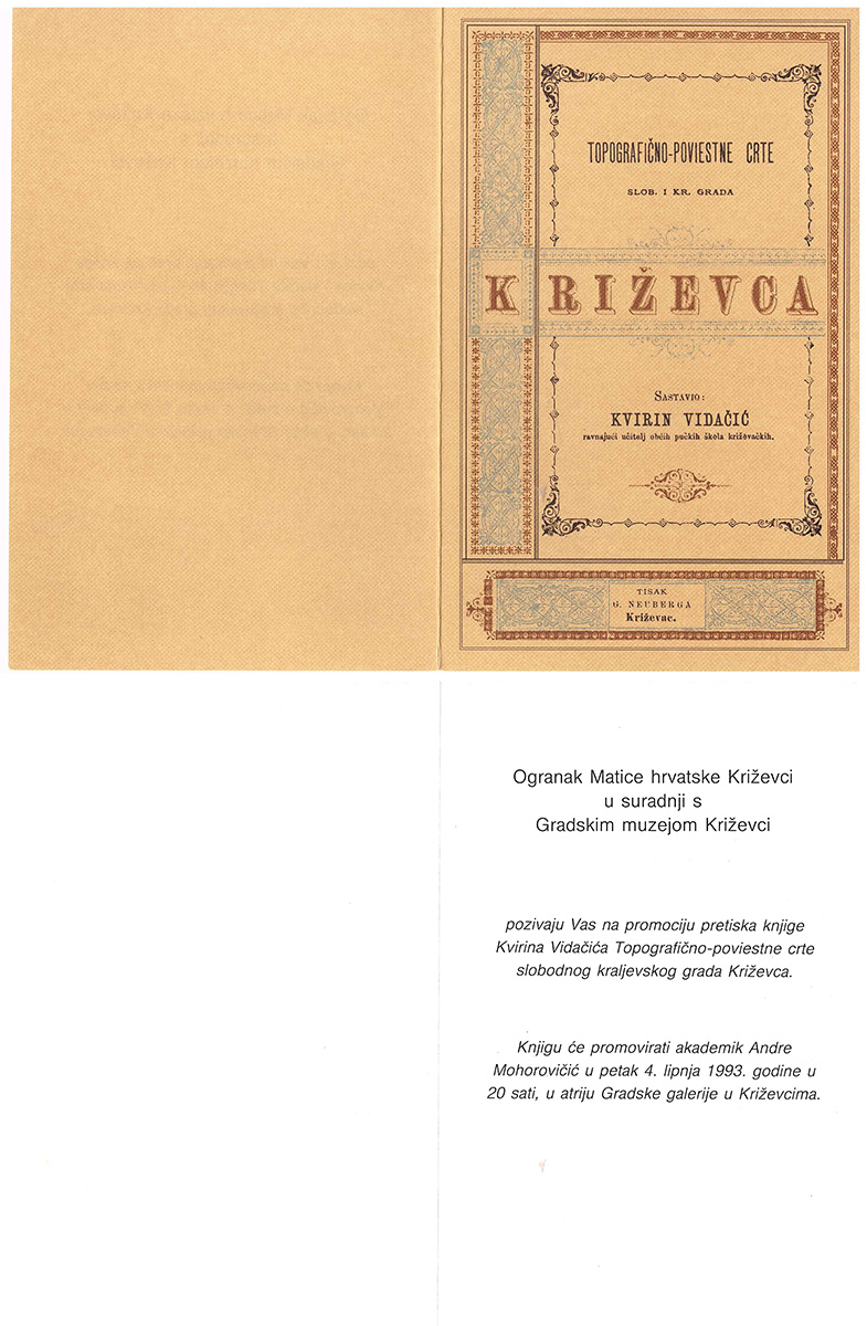 Tijekom Križevačkog velikog spravišča Ogranak Matice hrvatske organizirao je 4. lipnja 1993. u atriju Likovne galerije Gradskoga muzeja predstavljanje knjige Kvirina Vidačića Topografično-poviestne crte slobodnog kraljevskog grada Križevca iz 1886. O knjizi je govorio akademik Andre Mohorovičić.
