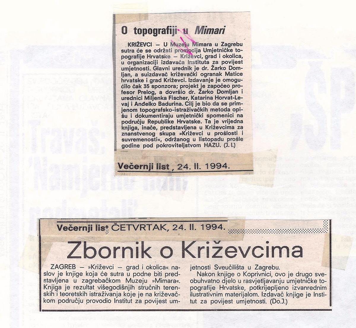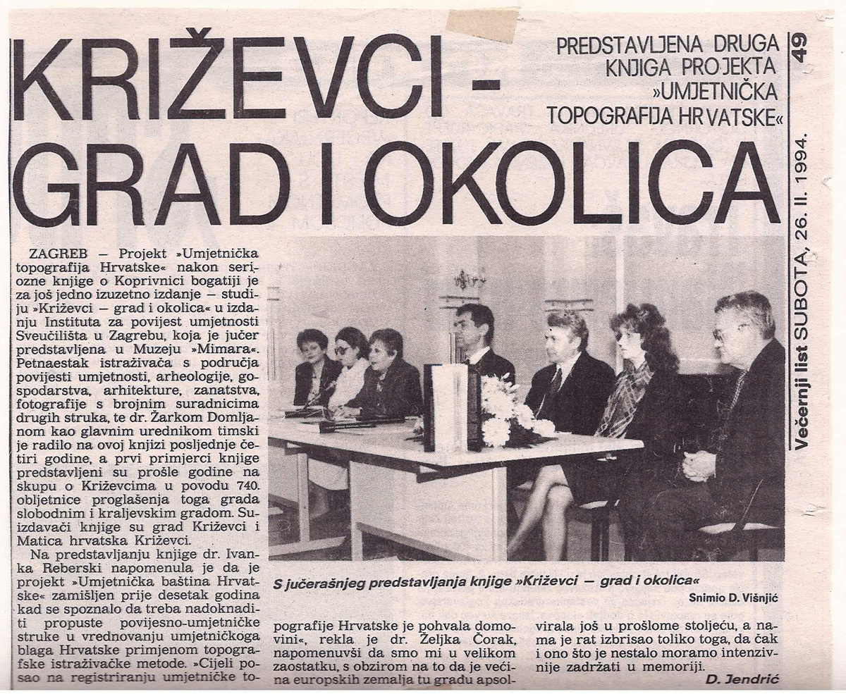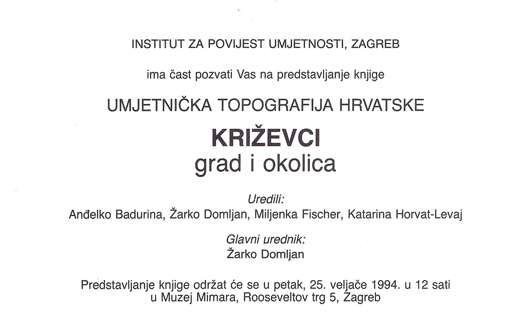 Knjiga „Križevci – grad i okolica” predstavljena je 25. veljače 1993. u Muzeju Mimara u Zagrebu. Knjiga je dio serijala „Umjetnička topografija Hrvatske” u izdanju Instituta za povijest umjetnosti Sveučilišta u Zagrebu, Ogranka MH u Križevcima i Grada Križevaca.