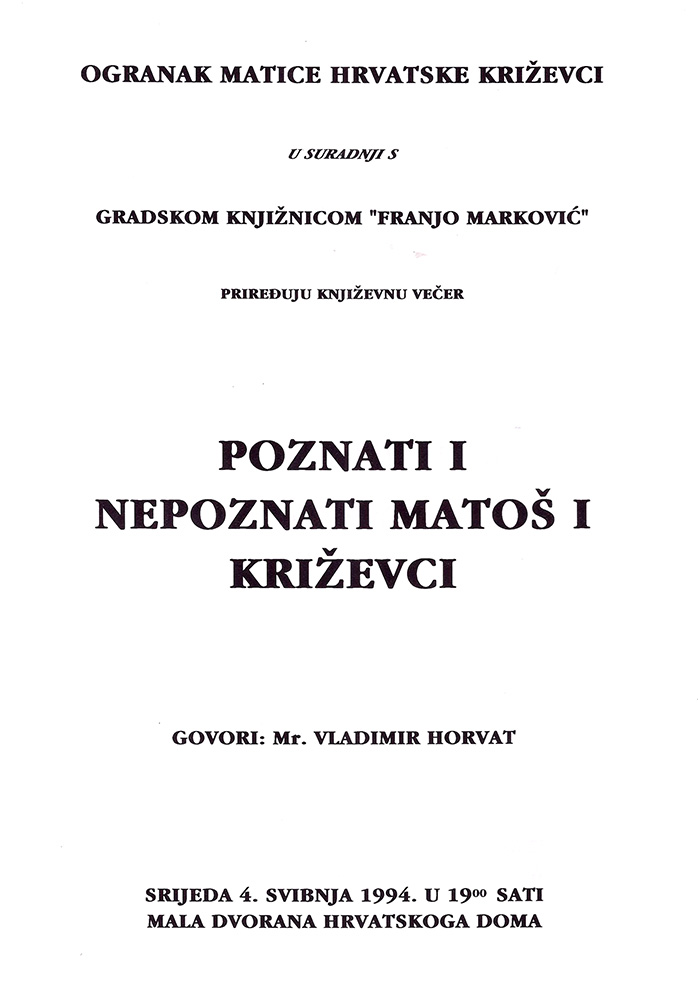 Ogranak Matice hrvatske Križevci u suradnji s Gradskom knjižnicom „Franjo Marković” priredio je u srijedu 4. svibnja 1994. u maloj dvorani Hrvatskoga doma književnu večer „Poznati nepoznati Matoš i Križevci”. Gost večeri bio je mr. Vladimir Horvat.
