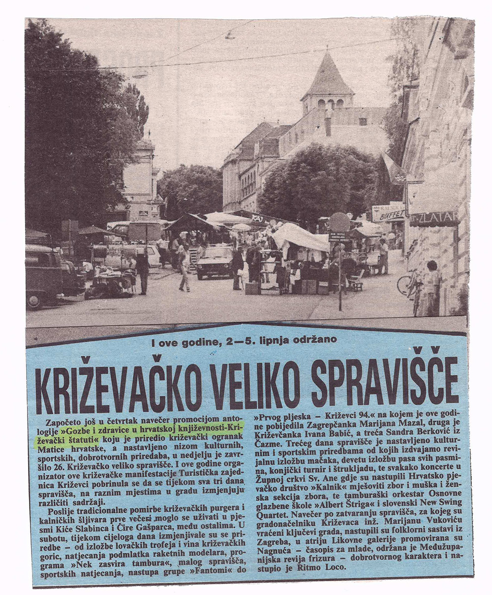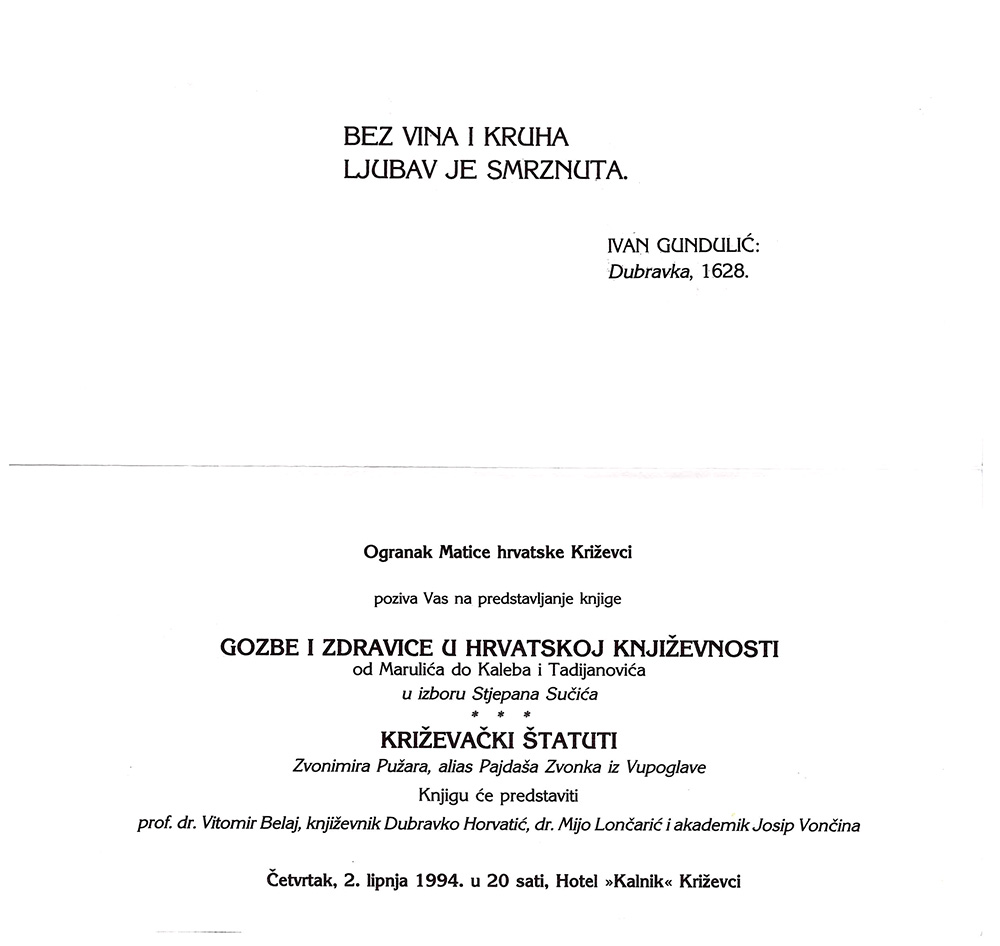 Tijekom 26. Velikog križevačkog spravišča Ogranak Matice hrvatske u Križevcima promovirao je svoju osmu knjigu, Gozbe i zdravice u hrvatskoj književnosti, od Marulića do Kaleba i Tadijanovića u izboru Stjepana Sučića. Sastavni dio knjige čine i Križevački štatuti Zvonimira Pužara. Promocija se održala u Hotelu Kalnik 2. lipnja 1994., a knjigu su predstavljali prof. dr. Vitomir Belaj, književnik Dubravko Horvatić, dr. Mijo Lončarić i akademik Josip Vončina. Tekstove su čitali glumci Vanja Drach i Richard Simonelli, a spelanciju prema vinsko-pajdaškim regulama izveli su, uz pratnju Križevačkih tamburaša, varoški sudec Slavko Balog i kalnički kaštelan Nikola Novosel.