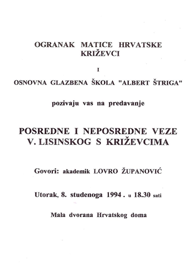 Ogranak Matice hrvatske Križevci i Osnovna glazbena škola „Albert Štriga” organizirali su 8. studenog 1994. predavanje akademika Lovre Županovića pod naslovom „Posredne i neposredne veze Vatroslava Lisinskog s Križevcima”.