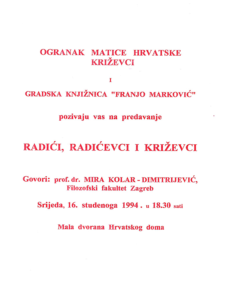 U srijedu, 16. studenoga 1994. održano je u organizaciji Ogranka MH Križevci i Gradske knjižice „Franjo Marković” predavanje „Radići, radićevci i Križevci” prof. dr. Mire Kolar-Dimitrijević.