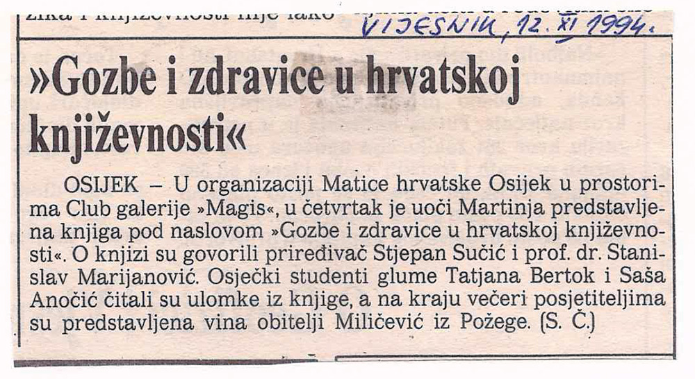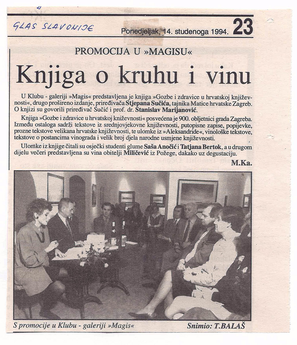 U Klubu-galeriji Magis u Osijeku predstavljena je 10. prosinca 1994. knjiga „Gozbe i zdravice u hrvatskoj književnosti”. O knjizi su govorili priređivač Stjepan Sučić i prof. dr. Stanislav Marijanović. Osječki studenti glume Tatjana Bertok i Saša Anočić čitali su ulomke iz knjige, a na kraju večeri posjetiteljima su predstavljena vina obitelji Miličević iz Požege.