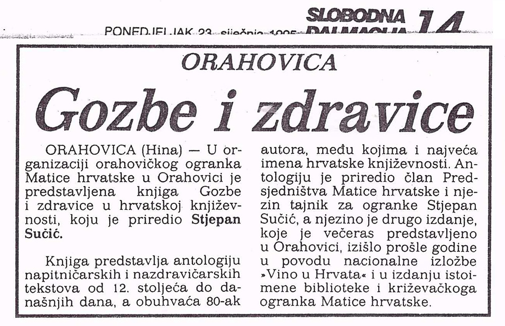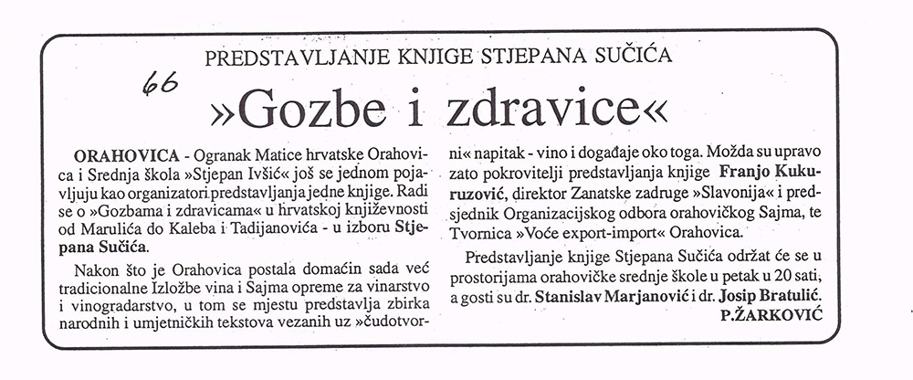 U Orahovici, u prostorijama srednje škole predstavljena je 20. siječnja 1995. knjiga „Gozbe i zdravice u hrvatskoj književnosti” Ogranka MH Križevci. O knjizi su govorili prof. dr. Josip Bratulić, prof. dr. Stanislav Marjanović, mr. Renata Husinec i Stjepan Sučić.