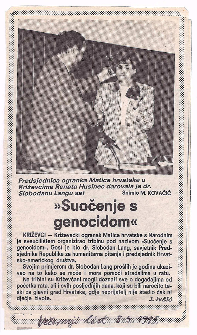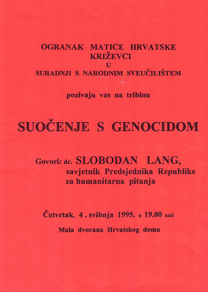 1995. / Tribine / okrugli stolovi Tribina „Suočenje s genocidom” 04/05/199505/01/2021 martinarebic Ogranak Matice hrvatske Križevci i Gradska knjižnica „Franjo Marković” organizirali su 4. svibnja 1995. tribinu „Suočenje s genocidom” na kojoj je gostovao dr. Slobodan Lang, savjetnik predsjednika Republike za humanitarna pitanja. Podjeli ovo: Share on X(Otvara se u novom prozoru) X Podijeli na Facebooku (Otvara se u novom prozoru) Facebook Lajk Učitavanje...