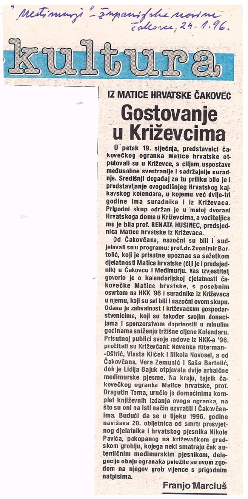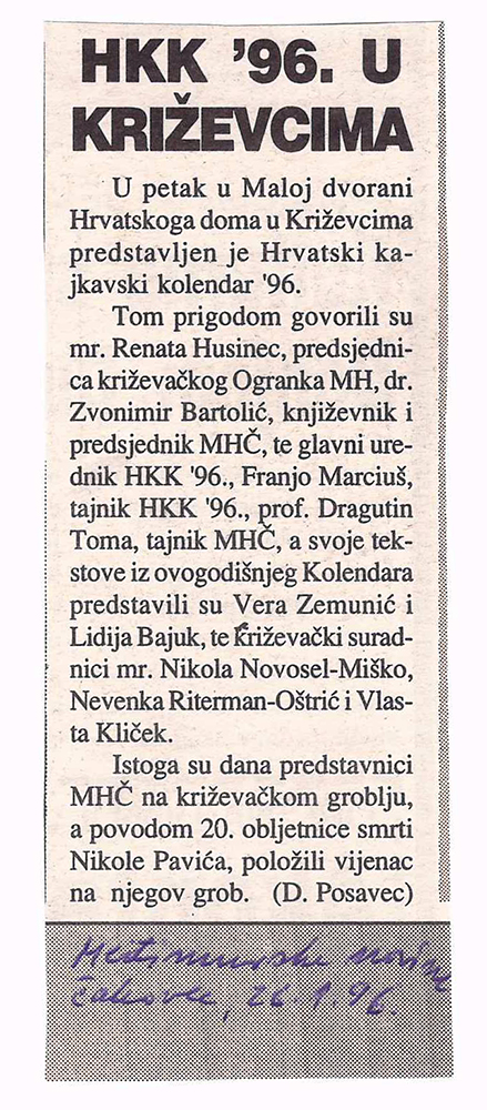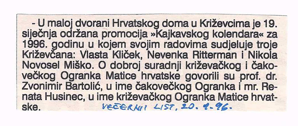 U maloj dvorani Hrvatskog doma u Križevcima je 19. siječnja 1996. održana promocija »Kajkavskog kolendara« za 1996. godinu u kojem svojim radovima sudjeluje troje Križevčana: Vlasta Kliček, Nevenka Ritterman i Nikola Novosel Miško. O dobroj suradnji križevačkog i čakovečkog Ogranka Matice hrvatske govorili su prof. dr. Zvonimir Bartolić, uime čakovečkog Ogranka i mr. Renata Husinec, uime križevačkog Ogranka Matice hrvatske.