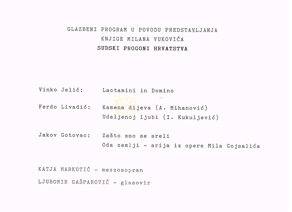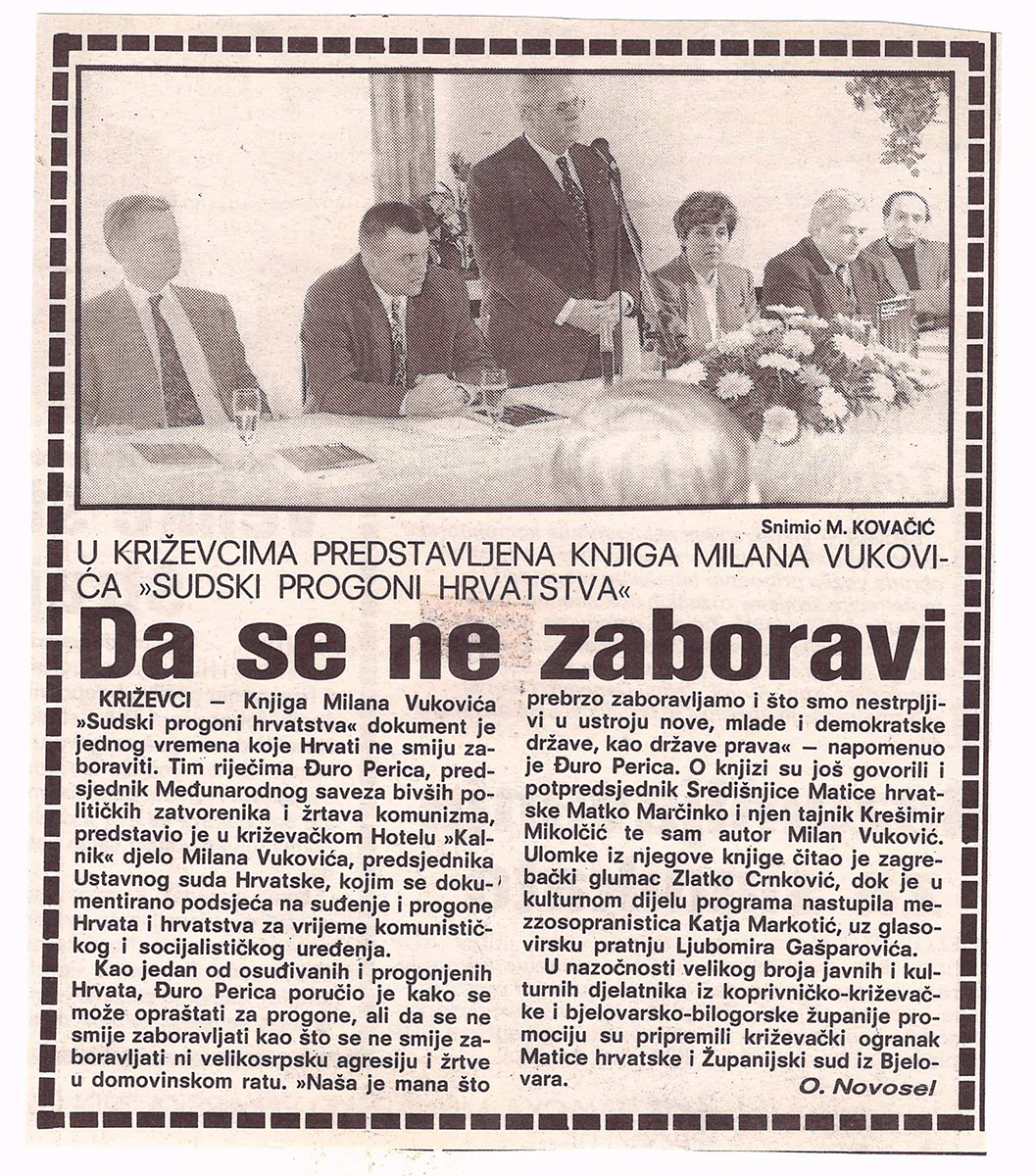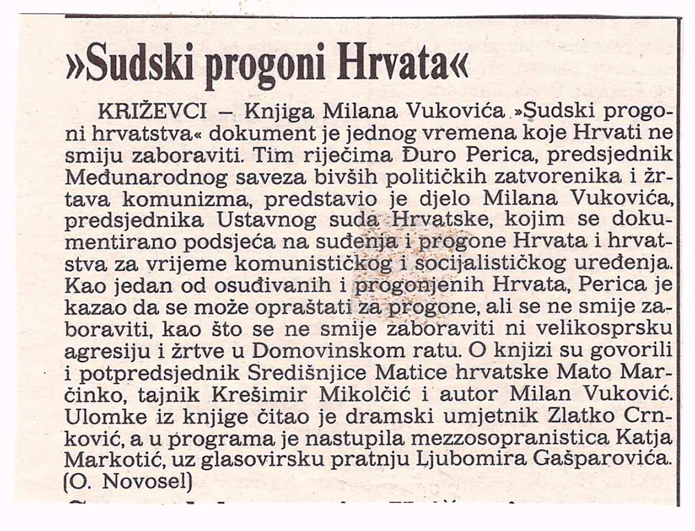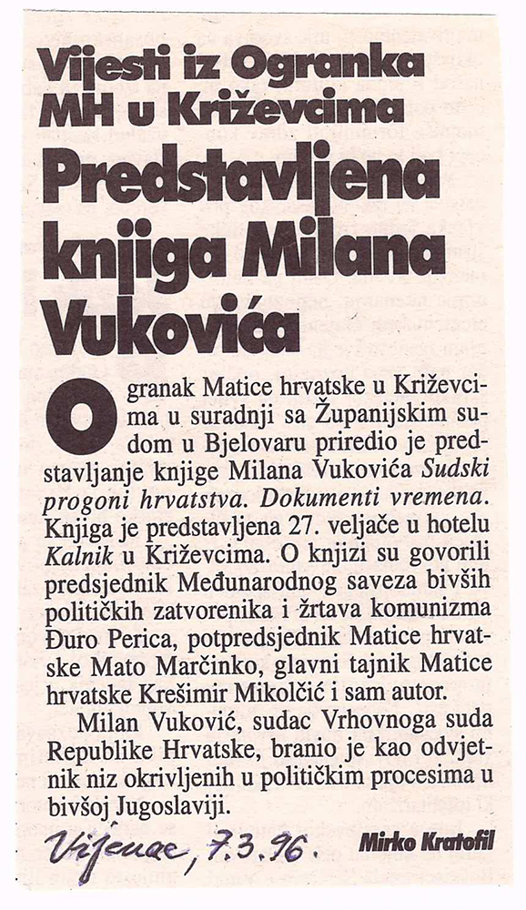 Ogranak Matice hrvatske u Križevcima u suradnji sa Županijskim sudom u Bjelovaru priredio je predstavljanje knjige Milana Vukovića Sudski progoni hrvatstva. Dokumenti vremena. Knjiga je predstavljena 27. veljače 1996. u hotelu Kalnik u Križevcima. O knjizi su govorili predsjednik Međunarodnog saveza bivših političkih zatvorenika i žrtava komunizma Đuro Perica, potpredsjednik Matice hrvatske Mato Marčinko, glavni tajnik Matice hrvatske Krešimir Mikolčić i sam autor. Milan Vuković, sudac Vrhovnoga suda Republike Hrvatske, branio je kao odvjetnik niz okrivljenih u političkim procesima u bivšoj Jugoslaviji.