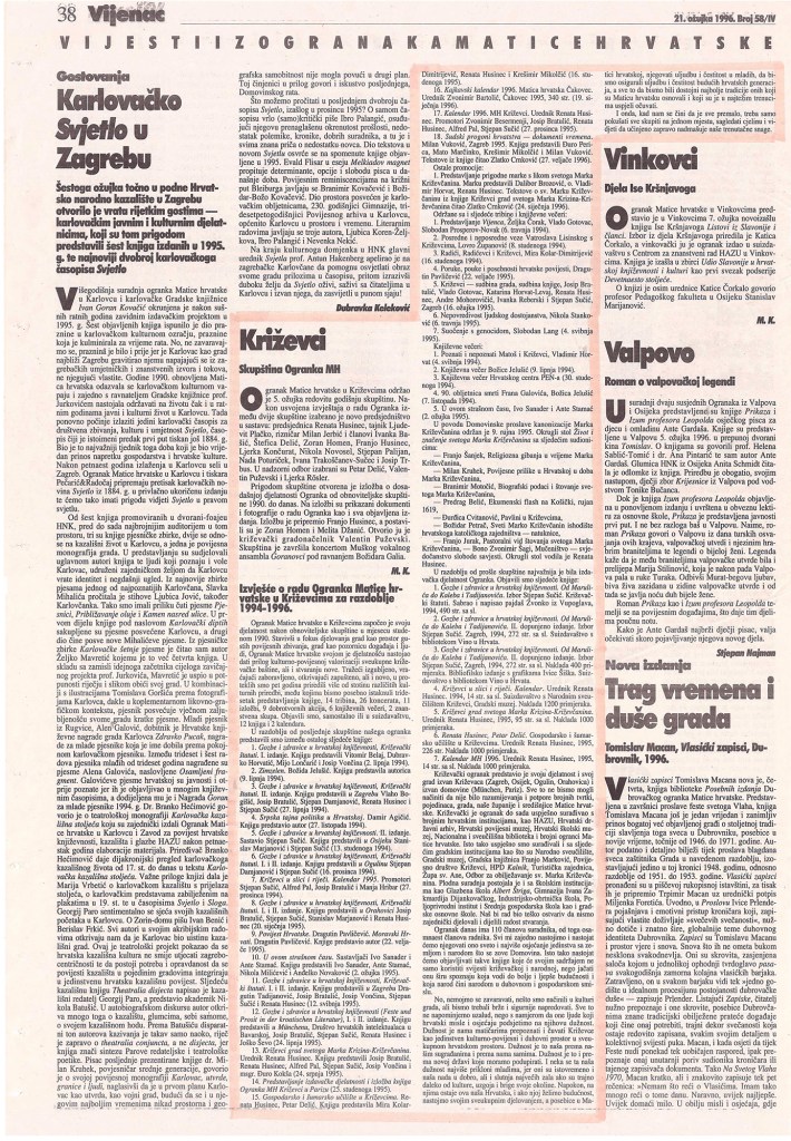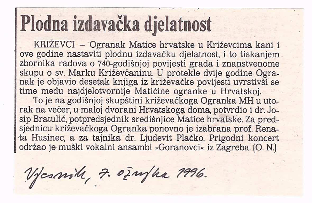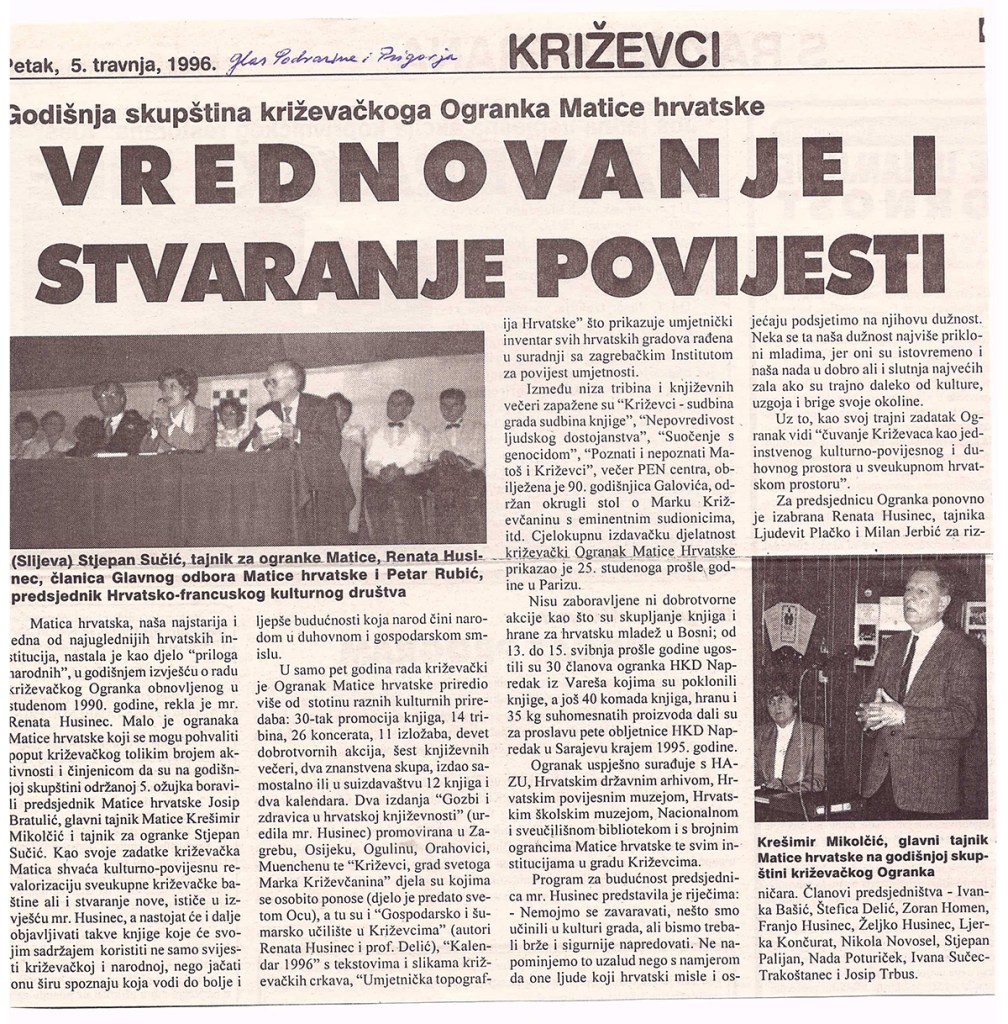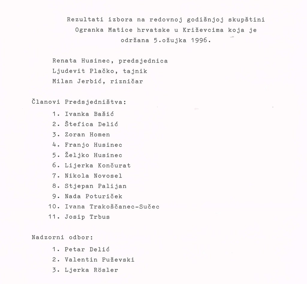U maloj dvorani Hrvatskoga doma održana je 5. ožujka 1996. redovna godišnja skupština Ogranka Matice hrvatske Križevci. Izvješće o radu podnijela je predsjednica Ogranka Renata Husinec . Da je križevački ogranak jedan od najaktivnijih potvrdio je i Josip Bratulić, potpredsjednik središnjice Matice hrvatske, glavni tajnik Krešimir Mikolčić i tajnik za ogranke Stjepan Sučić. Priređena je i izložba o dosadašnjoj djelatnosti Ogranka od obnoviteljske skupštine (1990.) do danas s mnoštvom dokumenata, fotografija, izrezaka iz novina i časopisa, plakata, kao i svih izdanja knjiga koje je Ogranak objavio. Materijal za izložbu sakupio je Franjo Husinec, a izložbu su postavili Zoran Homen i Melita Džanić. Prigodni koncert održao je muški vokalni ansambl »Goranovci« iz Zagreba.