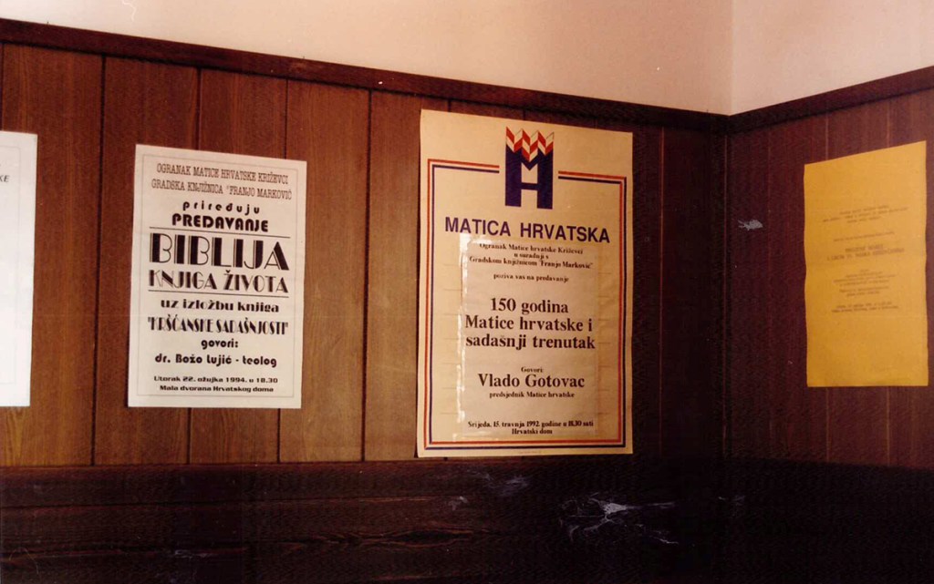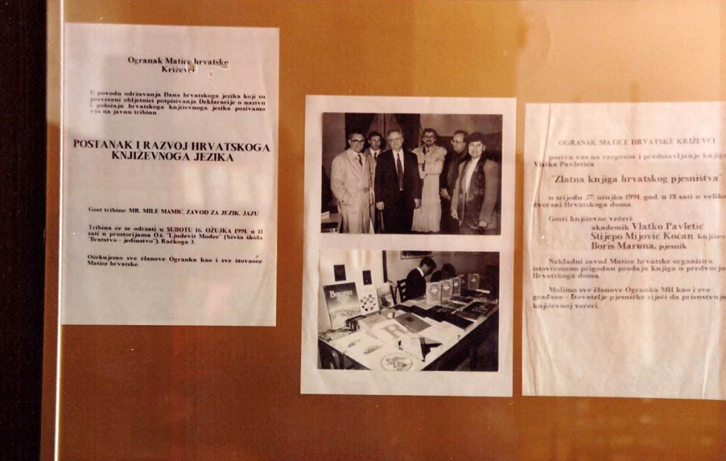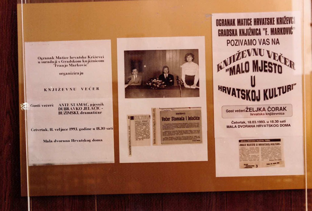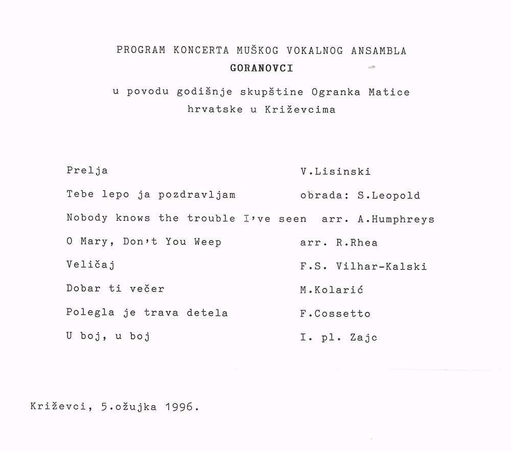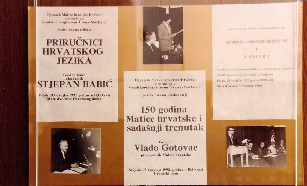 U maloj dvorani Hrvatskoga doma održana je 5. ožujka 1996. redovna godišnja skupština Ogranka Matice hrvatske Križevci. Izvješće o radu podnijela je predsjednica Ogranka Renata Husinec . Da je križevački ogranak jedan od najaktivnijih potvrdio je i Josip Bratulić, potpredsjednik središnjice Matice hrvatske, glavni tajnik Krešimir Mikolčić i tajnik za ogranke Stjepan Sučić. Priređena je i izložba o dosadašnjoj djelatnosti Ogranka od obnoviteljske skupštine (1990.) do danas s mnoštvom dokumenata, fotografija, izrezaka iz novina i časopisa, plakata, kao i svih izdanja knjiga koje je Ogranak objavio. Materijal za izložbu sakupio je Franjo Husinec, a izložbu su postavili Zoran Homen i Melita Džanić. Prigodni koncert održao je muški vokalni ansambl »Goranovci« iz Zagreba.