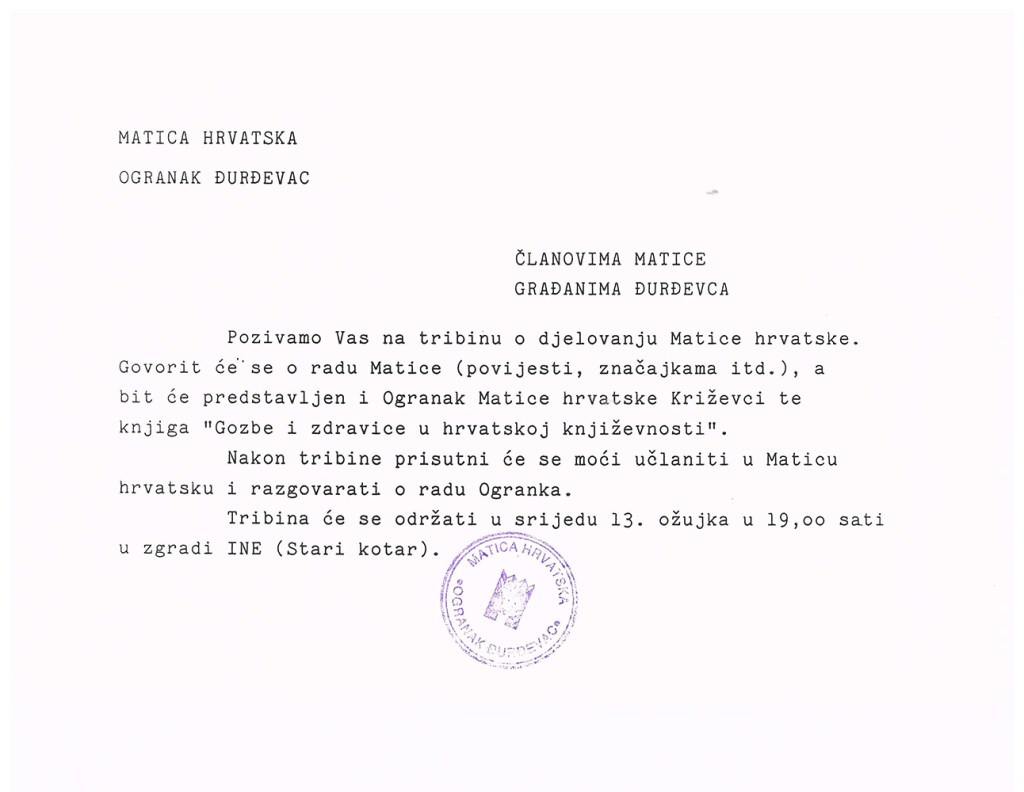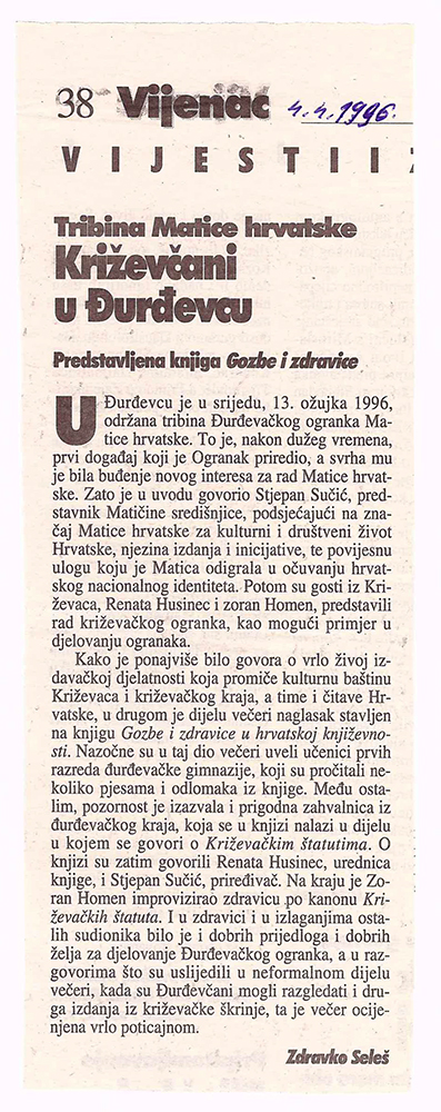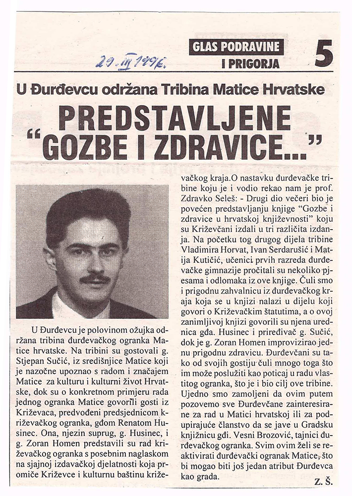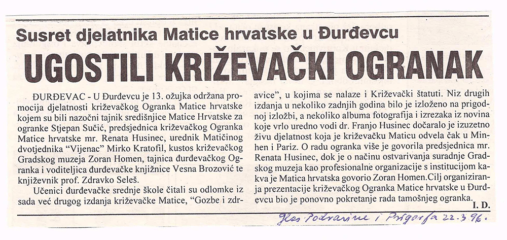 U Đurdevcu je 13. ožujka 1996. održana promocija djelatnosti križevačkog Ogranka Matice hrvatske kojem su bili nazočni tajnik središnjice Matice hrvatske za ogranke Stjepan Sučić, predsjednica križevačkog Ogranka Matice hrvatske mr. Renata Husinec, urednik Matičinog dvotjednika “Vijenac” Mirko Kratofil, kustos križevačkog Gradskog muzeja Zoran Homen, tajnica đurđevačkog Ogranka i voditeljica đurđevačke knjižnice Vesna Brozović te književnik prof. Zdravko Seleš.