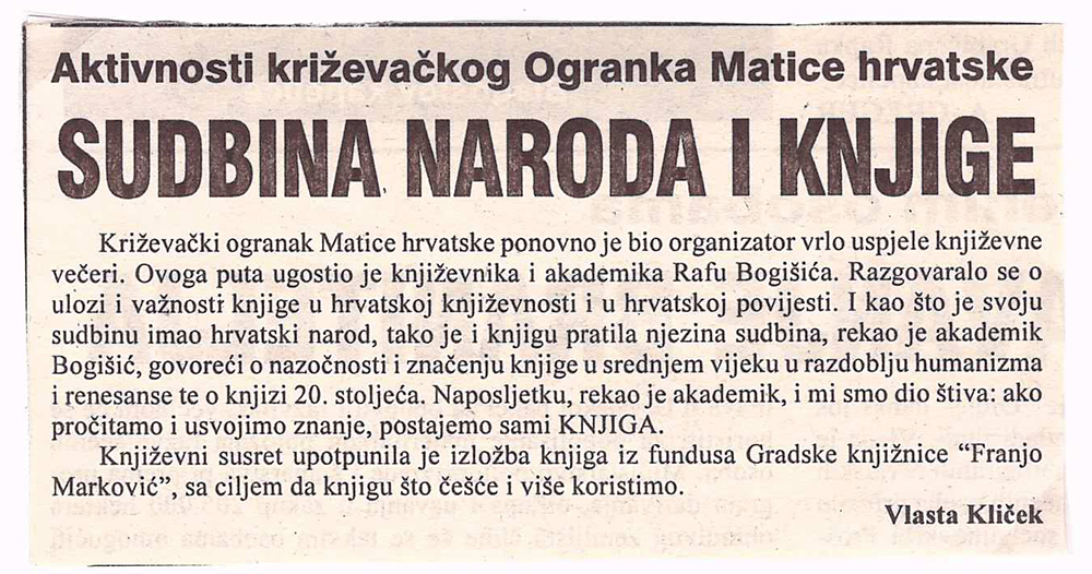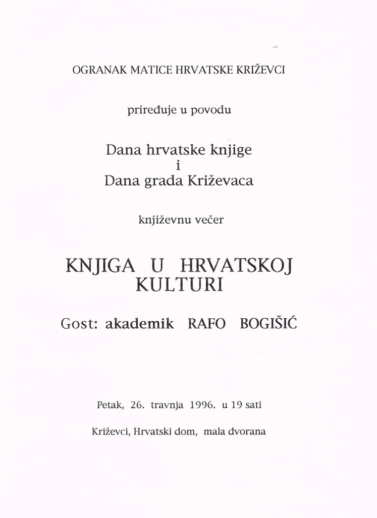 U organizaciji Ogranka Matice hrvatske Križevci u Hrvatskom domu u Križevcima u petak 26. travnja 1996. održano je predavanje hrvatskoga književnika, sveučilišnoga profesora, akademika Rafe Bogišića pod nazivom Knjiga u hrvatskoj kulturi. Uime križevačkoga ogranka Matice hrvatske brojne je okupljene ljubitelje hrvatske knjige pozdravila predsjednica ogranka mr. Renata, Husinec. Istaknula je da je predavanje o knjizi u hrvatskoj kulturi organizirano u povodu 744. obljetnice postojanja Križevaca, kao slobodnoga kraljevskog grada, te u povodu novoustanovljenoga Dana hrvatske knjige, 22. travnja.