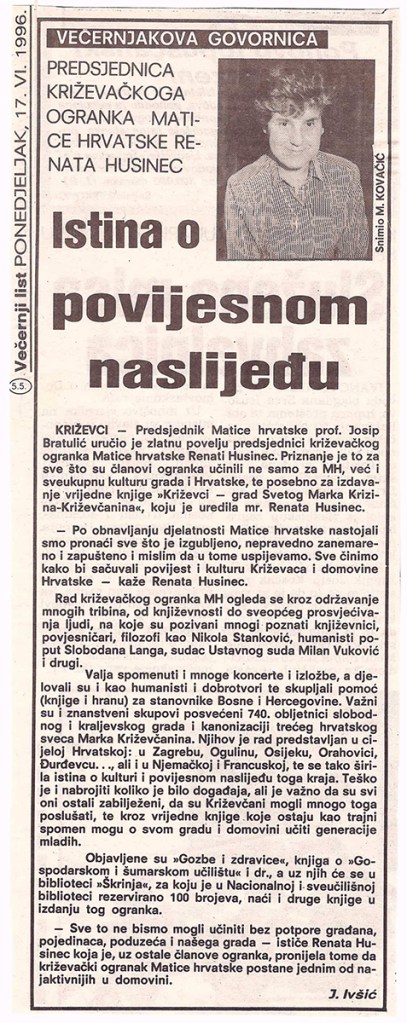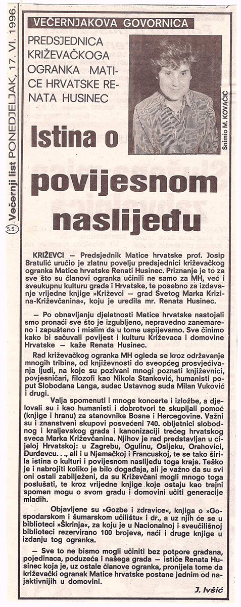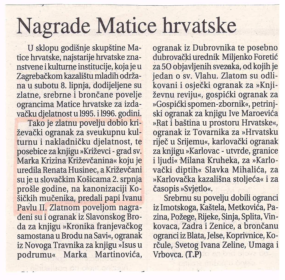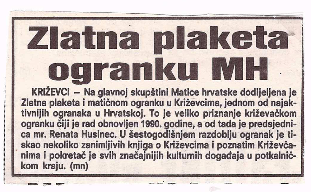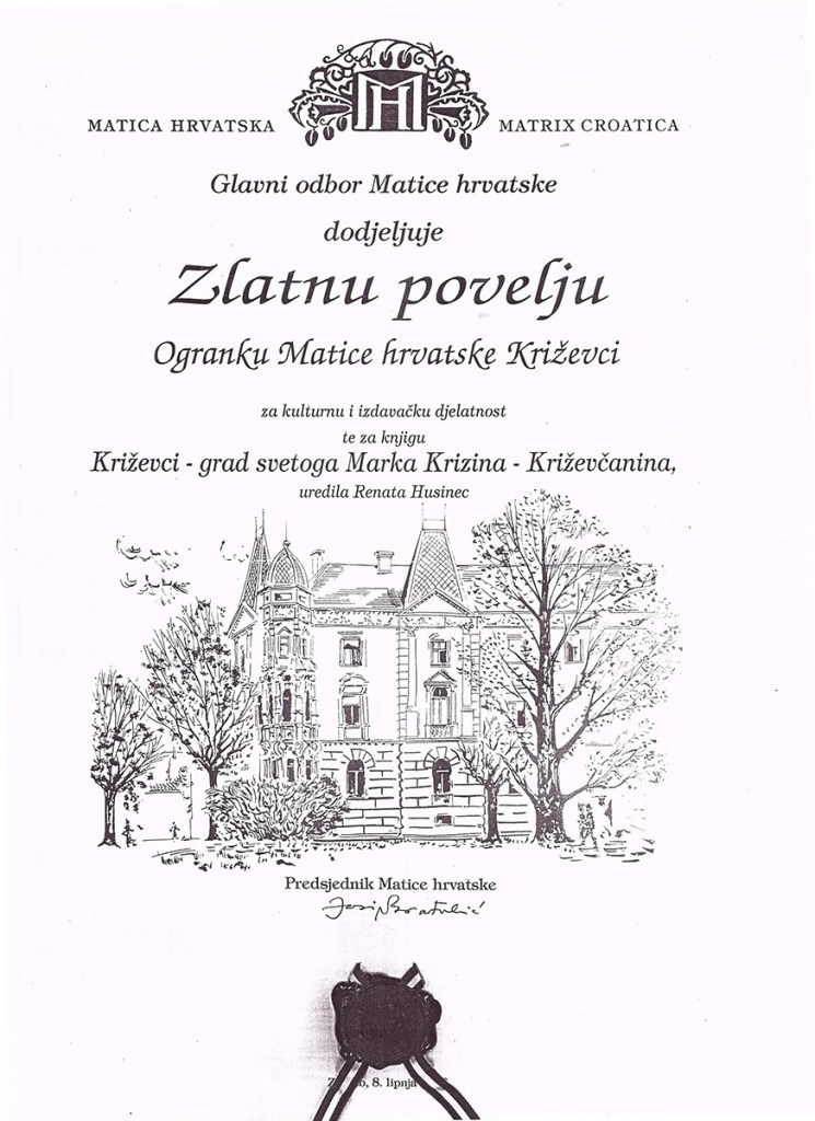 Na glavnoj skupštini Matice hrvatske dodijeljena je Zlatna povelja Ogranku Matice hrvatske u Križevcima, jednom od najaktivnijih ogranaka u Hrvatskoj. To je veliko priznanje križevačkom ogranku čiji je rad obnovljen 1990. godine, a od tada je predsjednica mr. Renata Husinec. U šestogodišnjem razdoblju ogranak je tiskao nekoliko zanimljivih knjiga o Križevcima i poznatim Križevčanima i pokretač je svih značajnijih kulturnih događaja u potkalničkom kraju.