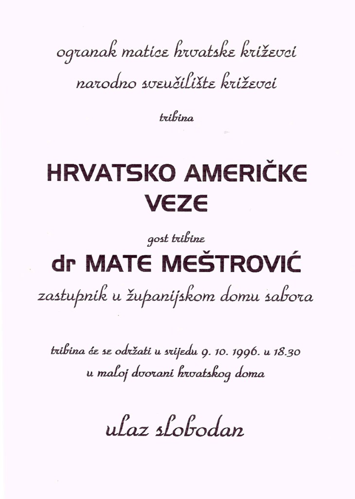 U organizaciji Ogranka Matice hrvatske Križevci i Narodnog sveučilišta Križevci održana je u maloj dvorani Hrvatskoga doma 9. listopada 1996. tribina Hrvatsko-američke veze. Gost tribine bio je zastupnik u županijskom domu Sabora dr. Mate Meštrović. Uz tribinu postavljena je i prigodna izložba knjiga Gradske knjižnice „Franjo Marković”.
