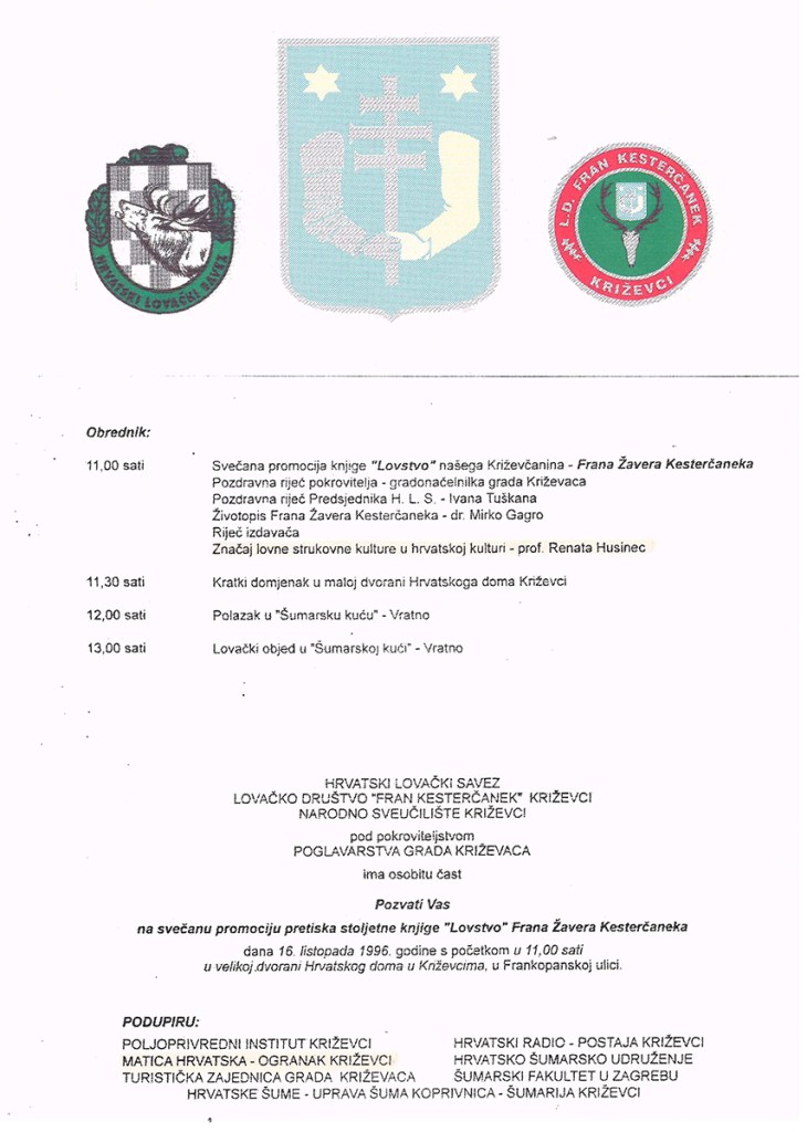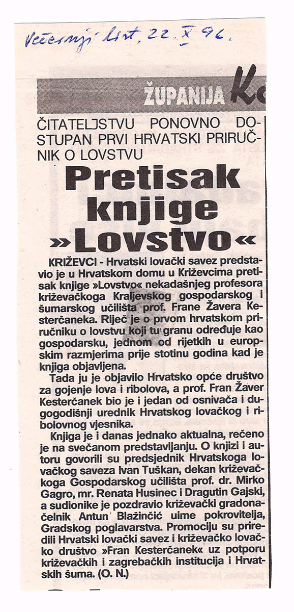 Hrvatski lovački savez predstavio je 16. listopada 1996. u Hrvatskom domu u Križevcima pretisak knjige »Lovstvo« nekadašnjeg profesora križevačkoga Kraljevskog gospodarskog i šumarskog učilišta prof. Frane Žavera Kesterčaneka. Riječ je o prvom hrvatskom priručniku o lovstvu koji tu granu određuje kao gospodarsku, jednom od rijetkih u europskim razmjerima prije stotinu godina kad je knjiga objavljena. O knjizi i autoru govorili su predsjednik Hrvatskoga lovačkog saveza Ivan Tuškan, dekan križevačkoga Gospodarskog učilišta prof. dr. Mirko Gagro, predsjednica Ogranka MH Križevci mr. Renata Husinec i Dragutin Gajski, a sudionike je pozdravio križevački gradonačelnik Antun Blažinčić uime pokrovitelja, Gradskog poglavarstva.