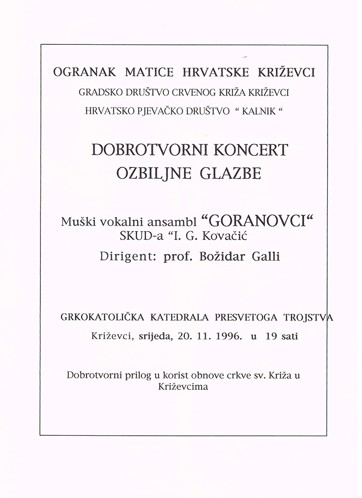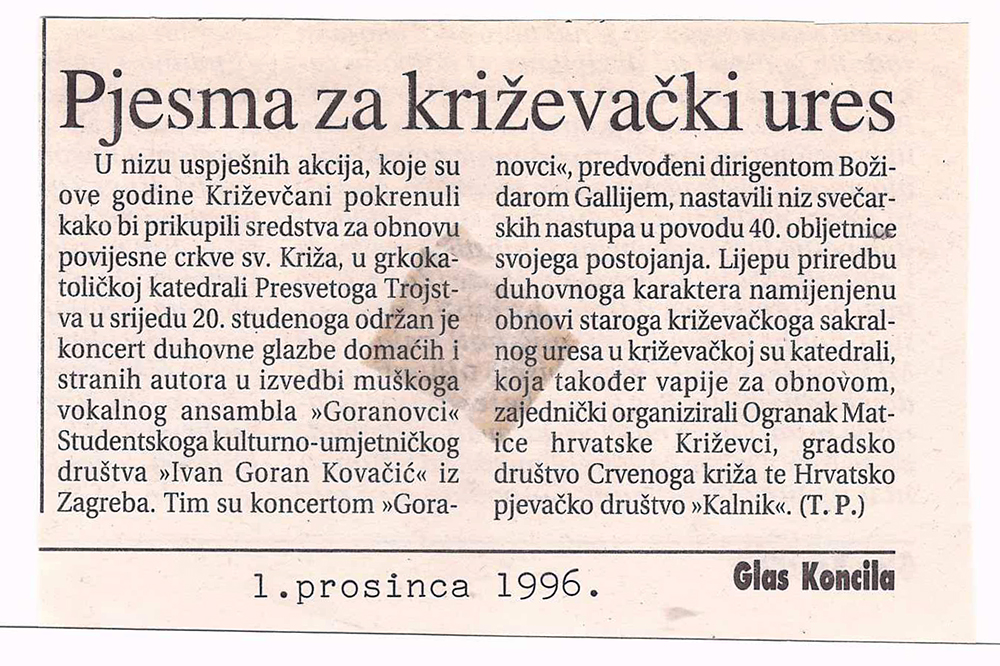 U nizu uspješnih akcija, koje su ove godine Križevčani pokrenuli kako bi prikupili sredstva za obnovu povijesne crkve Sv. Križa, u grkokatoličkoj katedrali Presvetoga Trojstva u srijedu 20. studenoga 1996. održan je koncert duhovne glazbe domaćih stranih autora u izvedbi muškoga vokalnog ansambla »Goranovci« Studentskoga kulturno-umjetničkog društva »Ivan Goran Kovačić« iz Zagreba. Tim su koncertom »Goranovci«, predvođeni dirigentom Božidarom Gallijem, nastavili niz svečarskih nastupa u povodu 40. obljetnice svojega postojanja. Lijepu priredbu duhovnoga karaktera namijenjenu obnovi staroga križevačkoga sakralnog uresa u križevačkoj su katedrali, koja također vapi za obnovom, zajednički organizirali Ogranak Matice hrvatske Križevci, gradsko društvo Crvenoga križa te Hrvatsko pjevačko društvo »Kalnik«.