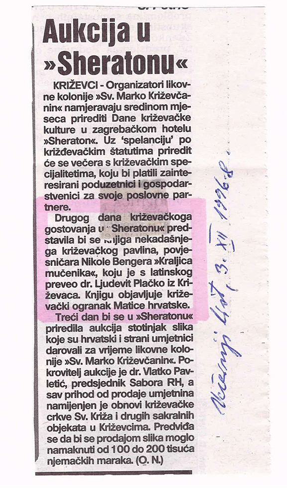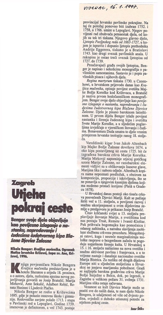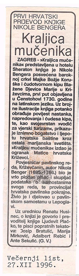 »Kraljica mučenika«, predstavljena 18. prosinca 1996. u hotelu Sheraton, knjiga je Nikole Bengera posvećena baroknoj crkvi Majke Božje Koruške i čudotvornom kipu Blažene Djevice Marije u Križevcima, prvi put objavljena u Čenstohovi 1730. na latinskom jeziku. Uz brojne ilustracije knjiga potanko obraduje povijest nastanka, napredovanja i čudesa kipa te, kao svojevrstan »vodič za vjerski turizam « prikazuje iznimno bogatstvo i ljepotu hrvatske baštine kroz ostala marijanska svetišta. »Kraliicu mučenika« izdao je ogranak Matice hrvatske Križevci. Uz urednicu Renatu Husinec, o knjizi je govorio i prevoditelj knjige Ljudevit Plačko, te pisci popratnih tekstova: Josip Bratulić, Marija Mirković, Adalbert Rebić i Ante Sekulić.