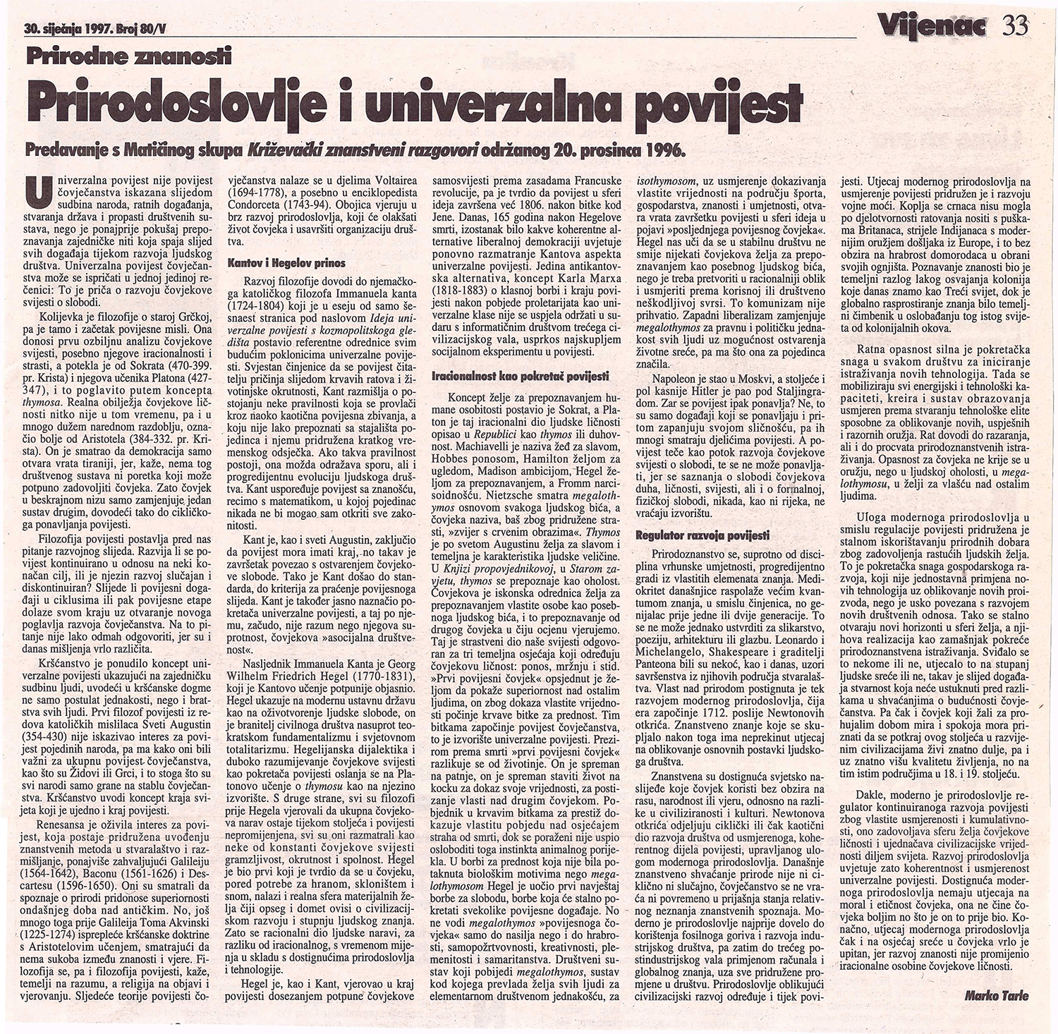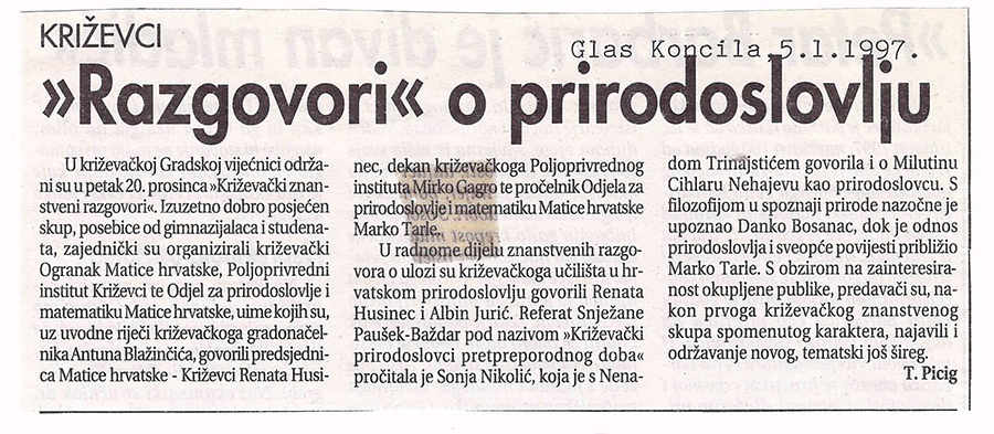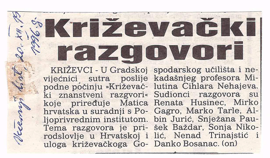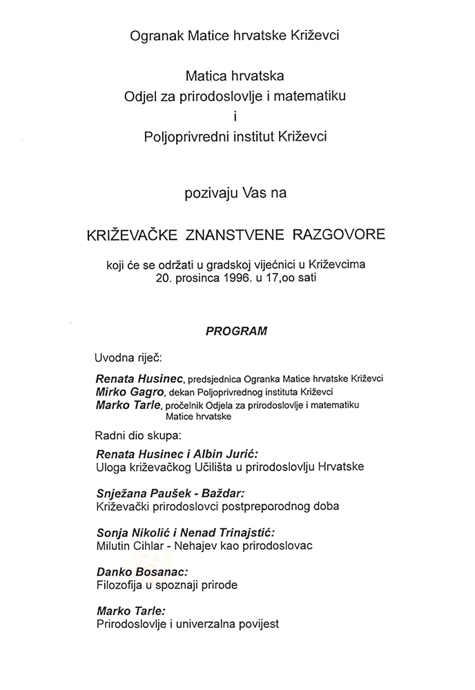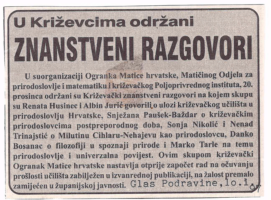 U Gradskoj vijećnici održani su 20. prosinca 1996. »Križevački znanstveni razgovori« koje je priredila Matica hrvatska u suradnji s Poljoprivrednim institutom. Tema razgovora je prirodoslovlje u Hrvatskoj i uloga križevačkoga Gospodarskog učilišta i nekadašnjeg profesora Milutina Cihlara Nehajeva. Sudionici razgovora su Renata Husinec, Mirko Gagro, Marko Tarle, Albin Jurić, Snježana Paušek Baždar, Sonja Nikolić, Nenad Trinajstić i Danko Bosanac.