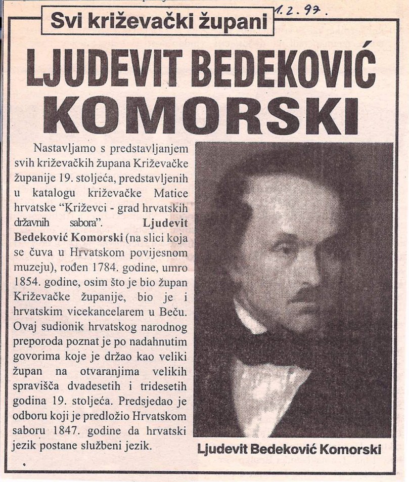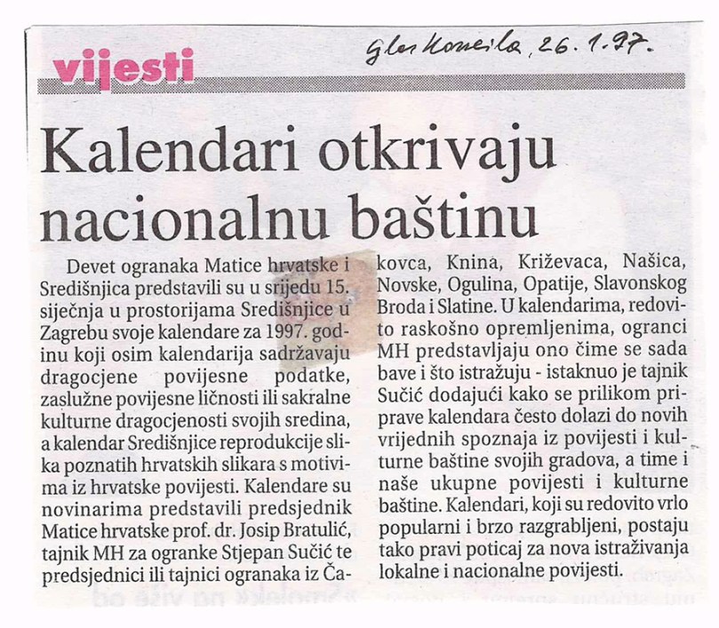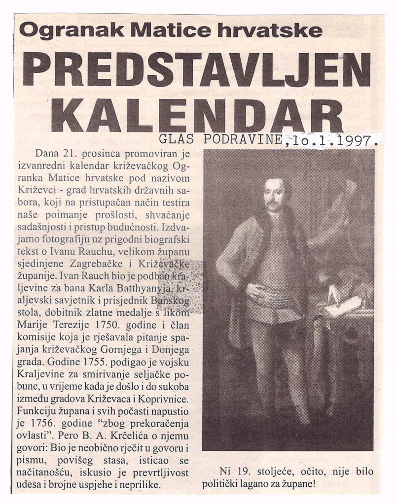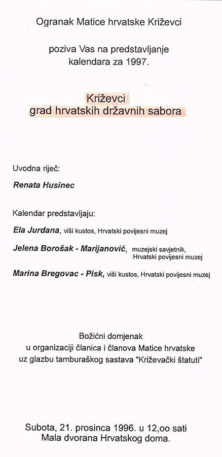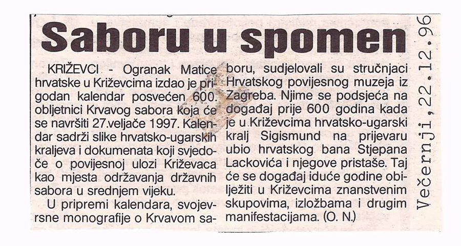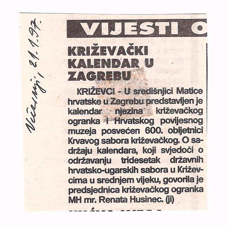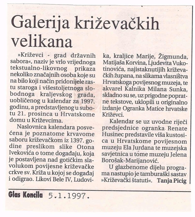 »Križevci – grad državnih sabora« naziv je vrlo vrijednoga tekstualno-likovnog prikaza nekoliko značajnih osoba koje su na bilo koji način pridonijele rastu staroga i višestoljetnoga slobodnoga kraljevskog grada, uobličenog u kalendar za 1997. godinu, a predstavljenog u subotu 21. prosinca 1996. u Hrvatskome domu u Križevcima. Naslovnica kalendara posvećena je poznatome krvavome saboru križevačkom iz 1397. godine preslikom slike Otona Ivekovića o tome događaju, koja je postavljena nad gotičkim slavolukom povijesne križevačke crkve sv. Križa u kojoj se događaj i odigrao. Likovi Bele IV, Ludovika, kraljice Marije, Žigmunda, Matijaša Korvina, Ljudevita Vukotinovića, najistaknutijih križevačkih župana, na slikama vlasništva Hrvatskoga povijesnog muzeja, te akvarel Kalnika Milana Sunka, skladno su se, uz prigodne popratne tekstove, uklopili u originalno izdanje Ogranka Matice hrvatske Križevci. Kalendar se uz uvodne riječi predsjednice ogranka Renate Husinec predstavile viša kustosica u Hrvatskome povijesnom muzeju Ela Jurdana te muzejska savjetnica u tome muzeju Jelena Borošak-Marijanović. U glazbenome dijelu programa nastupio je tamburaški sastav »Križevački štatuti«.