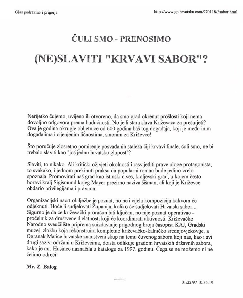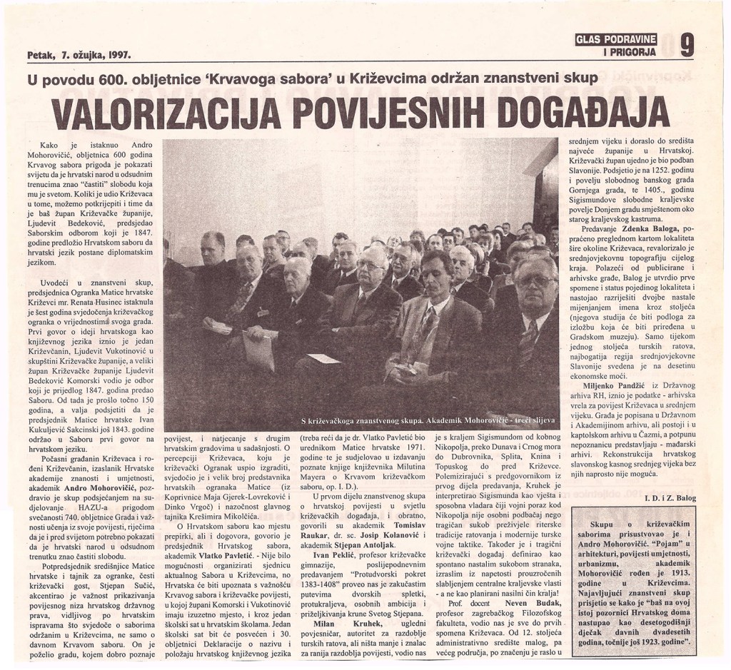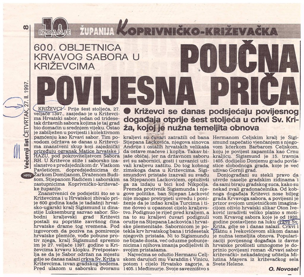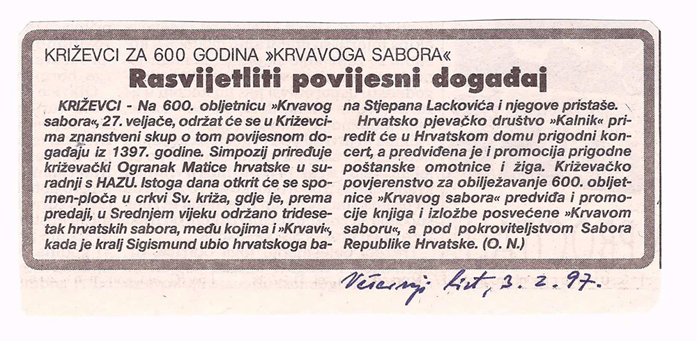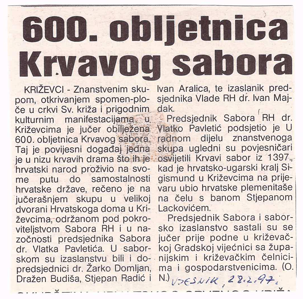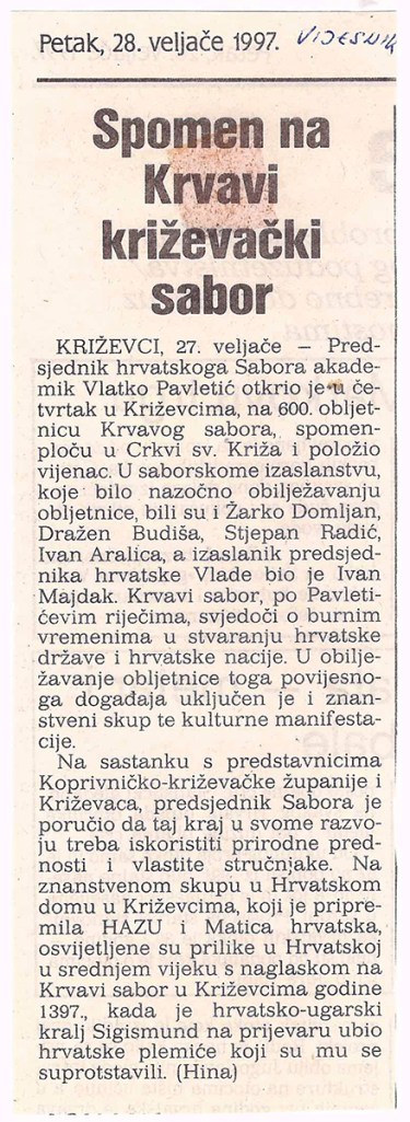 Predsjednik hrvatskoga Sabora akademik Vlatko Pavletić otkrio je u četvrtak u Križevcima, na 600. obljetnicu Krvavog sabora, spomen-ploču u crkvi Sv. Križa i položio vijenac. U saborskome izaslanstvu, koje je bilo nazočno obilježavanju obljetnice, bili su i Žarko Domljan, Dražen Budiša, Stjepan Radić, Ivan Aralica, a izaslanik predsjednika hrvatske Vlade bio je Ivan Majdak. Krvavi sabor, po Pavletićevim riječima, svjedoči o burnim vremenima u stvaranju hrvatske države i hrvatske nacije. U obilježavanje obljetnice toga povijesnoga događaja uključen je i znanstveni skup te kulturne manifestacije. Na sastanku s predstavnicima Koprivničko-križevačke županije i Križevaca, predsjednik Sabora je poručio da taj kraj u svome razvoju treba iskoristiti prirodne prednosti i vlastite stručnjake. Na znanstvenom skupu u Hrvatskom domu u Križevcima, koji je pripremila HAZU i Matica hrvatska, osvijetljene su prilike u Hrvatskoj u srednjem vijeku s naglaskom na Krvavi sabor u Križevcima godine 1397., kada je hrvatsko-ugarski kralj Sigismund na prijevaru ubio hrvatske plemiće koji su mu se suprotstavili.