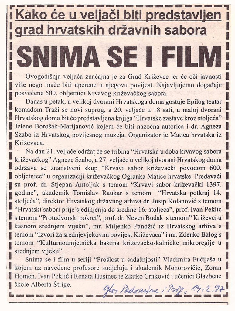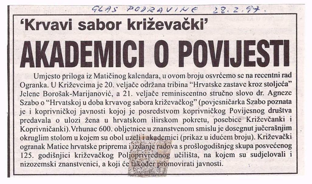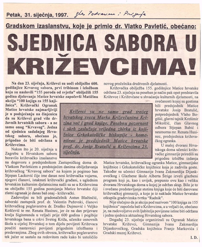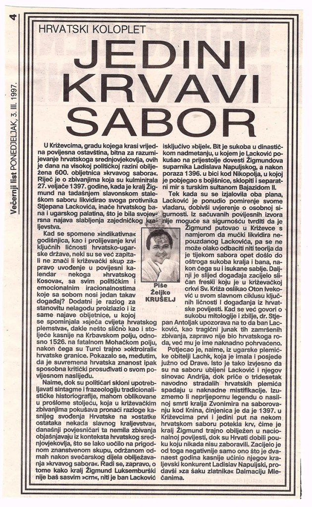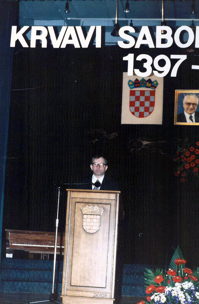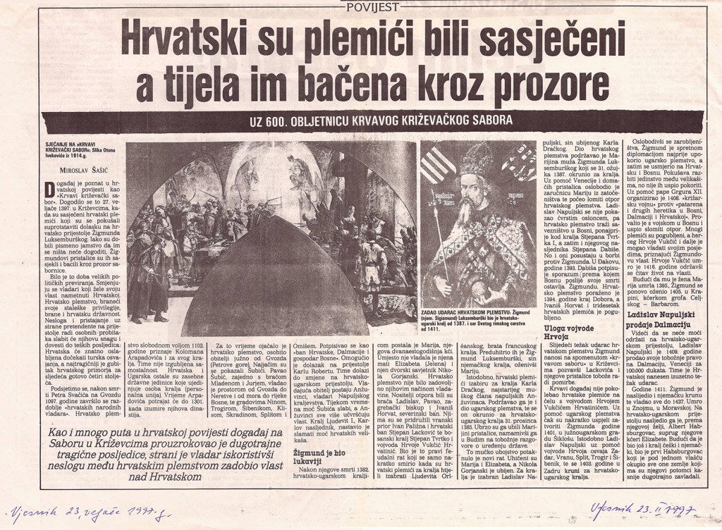 Predsjednik hrvatskoga Sabora akademik Vlatko Pavletić otkrio je u četvrtak u Križevcima, na 600. obljetnicu Krvavog sabora, spomen-ploču u crkvi Sv. Križa i položio vijenac. U saborskome izaslanstvu, koje je bilo nazočno obilježavanju obljetnice, bili su i Žarko Domljan, Dražen Budiša, Stjepan Radić, Ivan Aralica, a izaslanik predsjednika hrvatske Vlade bio je Ivan Majdak. Krvavi sabor, po Pavletićevim riječima, svjedoči o burnim vremenima u stvaranju hrvatske države i hrvatske nacije. U obilježavanje obljetnice toga povijesnoga događaja uključen je i znanstveni skup te kulturne manifestacije. Na sastanku s predstavnicima Koprivničko-križevačke županije i Križevaca, predsjednik Sabora je poručio da taj kraj u svome razvoju treba iskoristiti prirodne prednosti i vlastite stručnjake. Na znanstvenom skupu u Hrvatskom domu u Križevcima, koji je pripremila HAZU i Matica hrvatska, osvijetljene su prilike u Hrvatskoj u srednjem vijeku s naglaskom na Krvavi sabor u Križevcima godine 1397., kada je hrvatsko-ugarski kralj Sigismund na prijevaru ubio hrvatske plemiće koji su mu se suprotstavili.