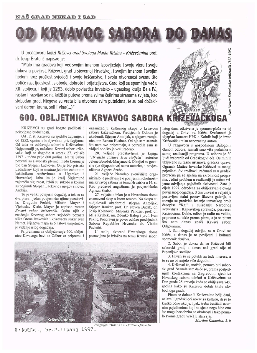 Predsjednik hrvatskoga Sabora akademik Vlatko Pavletić otkrio je u četvrtak u Križevcima, na 600. obljetnicu Krvavog sabora, spomen-ploču u crkvi Sv. Križa i položio vijenac. U saborskome izaslanstvu, koje je bilo nazočno obilježavanju obljetnice, bili su i Žarko Domljan, Dražen Budiša, Stjepan Radić, Ivan Aralica, a izaslanik predsjednika hrvatske Vlade bio je Ivan Majdak. Krvavi sabor, po Pavletićevim riječima, svjedoči o burnim vremenima u stvaranju hrvatske države i hrvatske nacije. U obilježavanje obljetnice toga povijesnoga događaja uključen je i znanstveni skup te kulturne manifestacije. Na sastanku s predstavnicima Koprivničko-križevačke županije i Križevaca, predsjednik Sabora je poručio da taj kraj u svome razvoju treba iskoristiti prirodne prednosti i vlastite stručnjake. Na znanstvenom skupu u Hrvatskom domu u Križevcima, koji je pripremila HAZU i Matica hrvatska, osvijetljene su prilike u Hrvatskoj u srednjem vijeku s naglaskom na Krvavi sabor u Križevcima godine 1397., kada je hrvatsko-ugarski kralj Sigismund na prijevaru ubio hrvatske plemiće koji su mu se suprotstavili.