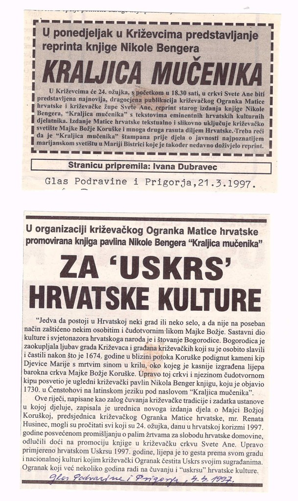 U Križevcima je 24. ožujka 1997. u crkvi sv. Ane predstavljena knjiga Kraljica mučenika, prijevod izdanja Nikole Bengera, križevačkoga pavlina koji je knjigu o štovanju Majke Božje Koruške napisao 1730. u Čenstohovi. O knjizi su govorili Josip Bratulić, Bonaventura Duda, Renata Husinec, Ljudevit Plačko, Adalbert Rebić i župnik Ivan Žufika. U glazbenom dijelu programa nastupio je Hrvatski sakralni trio.