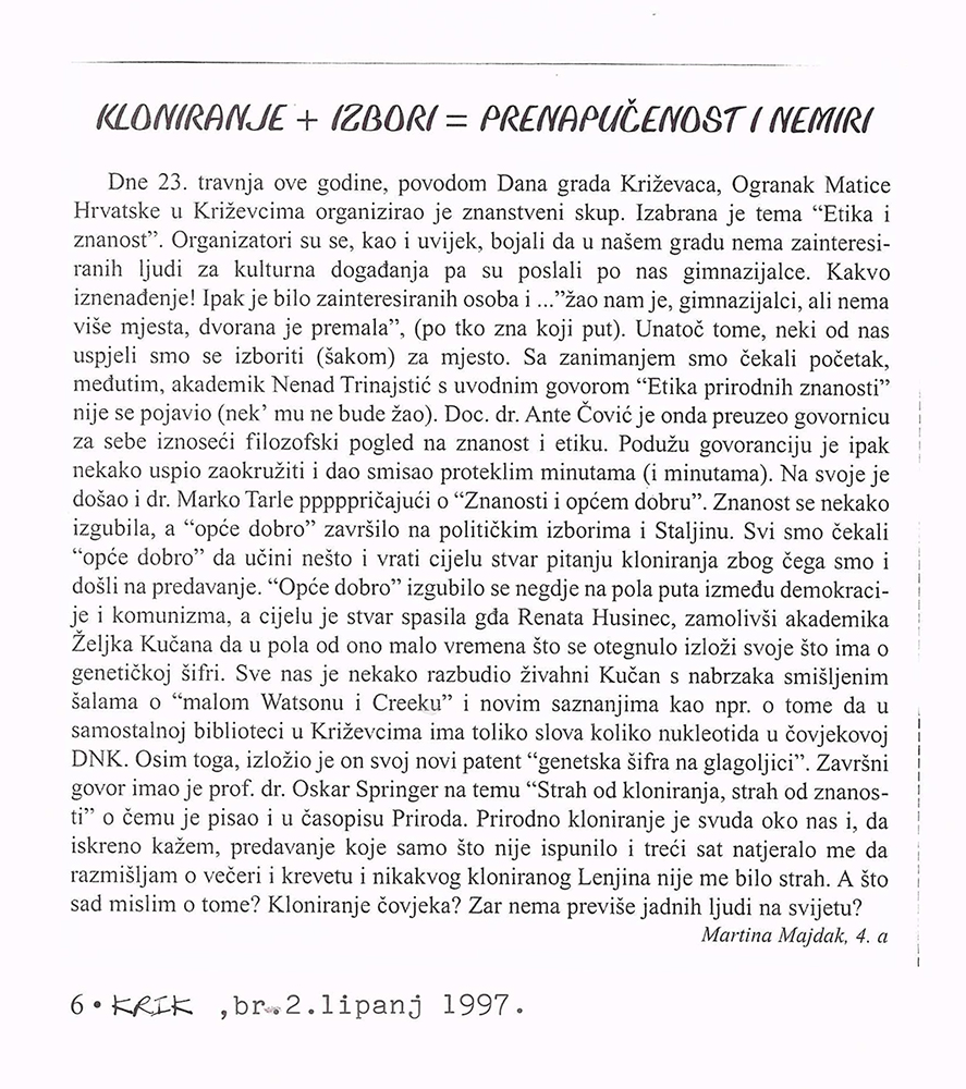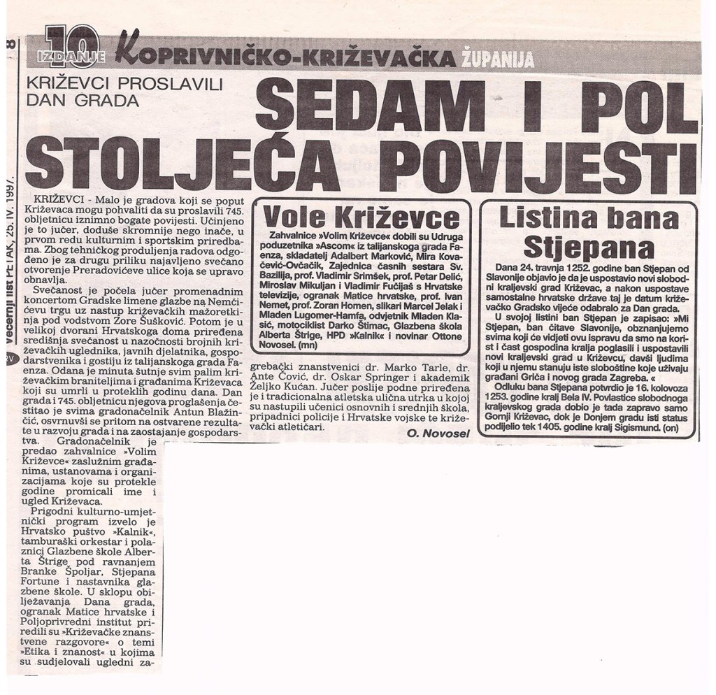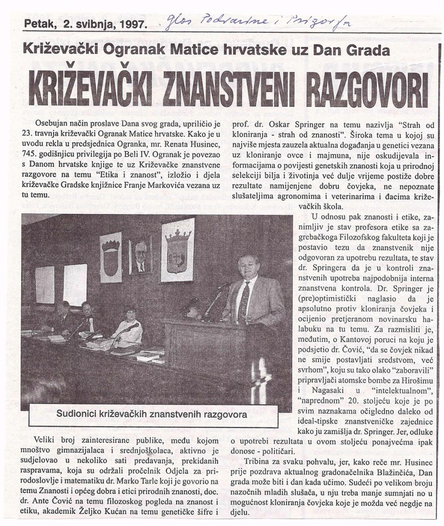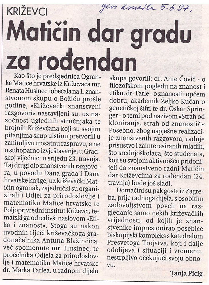 Za Dan grada Križevaca Ogranak MH Križevci organizirao je u gradskoj vijećnici Križevačke znanstvene razgovore na temu “Etika i znanost”. Uvodnu riječ održali su Renata Husinec, predsjednica Ogranka i Marko Tarle, pročelnik Odjela za prirodoslovlje i znanost. U radnome dijelu skupa govorili su akademik Nenad Tinajstić, dr. sc. Ante Čović, akademik Željko Kućan i prof. dr. Oskar Springer.