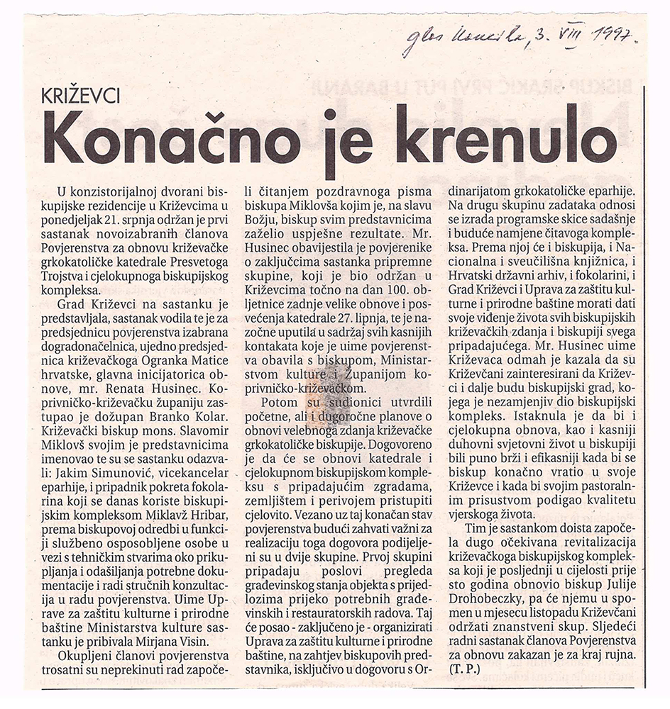 U konzistorijalnoj dvorani biskupijske rezidencije u Križevcima ponedjeljak 21. srpnja 1997. održan je prvi sastanak novoizabranih članova Povjerenstva za obnovu križevačke grkokatoličke katedrale Presvetoga Trojstva i cjelokupnoga biskupijskog kompleksa. Grad Križevci na sastanku je predstavljala, sastanak vodila te je za predsjednicu povjerenstva izabrana dogradonačelnica, ujedno predsjednica križevačkoga Ogranka Matice hrvatske, glavna inicijatorica obnove, mr. Renata Husinec.