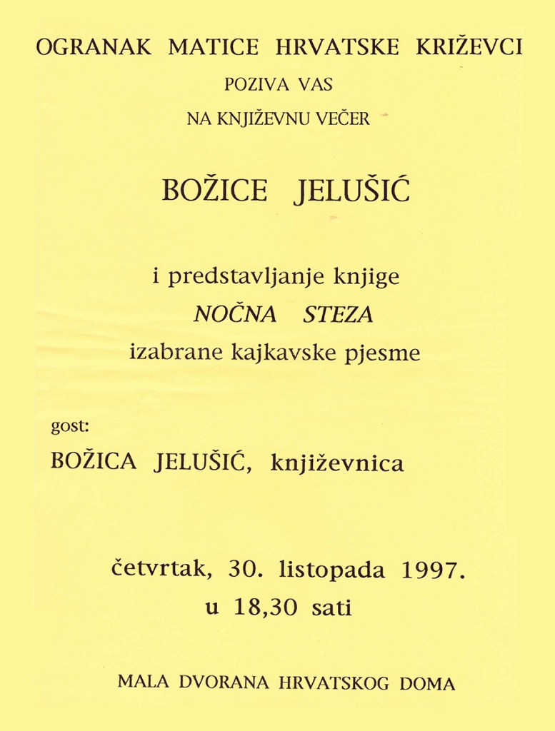 1997. / Predstavljanje publikacija Predstavljanje knjige Božice Jelušić 30/10/199701/07/2021 martinarebic Ogranak Matice hrvatske Križevci održao je u četvrtak 30. listopada 1997. u maloj dvorani Hrvatskoga doma predstavljanje knjige Nočna steza Božice Jelušić. Pjesnikinja je predstavila svoju zbirku kajkavske poezije. Podjeli ovo: Click to share on X(Otvara se u novom prozoru) X Klikom podijelite na Facebooku(Otvara se u novom prozoru) Facebook Lajk Učitavanje...