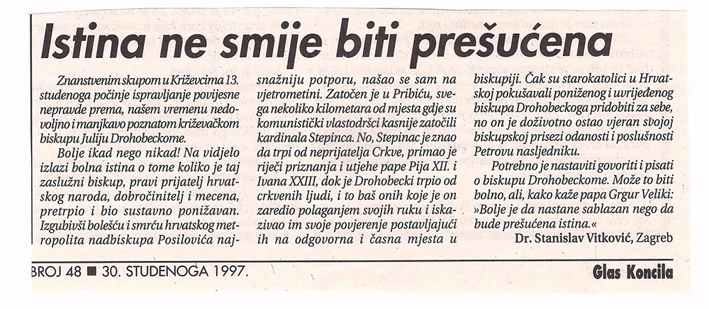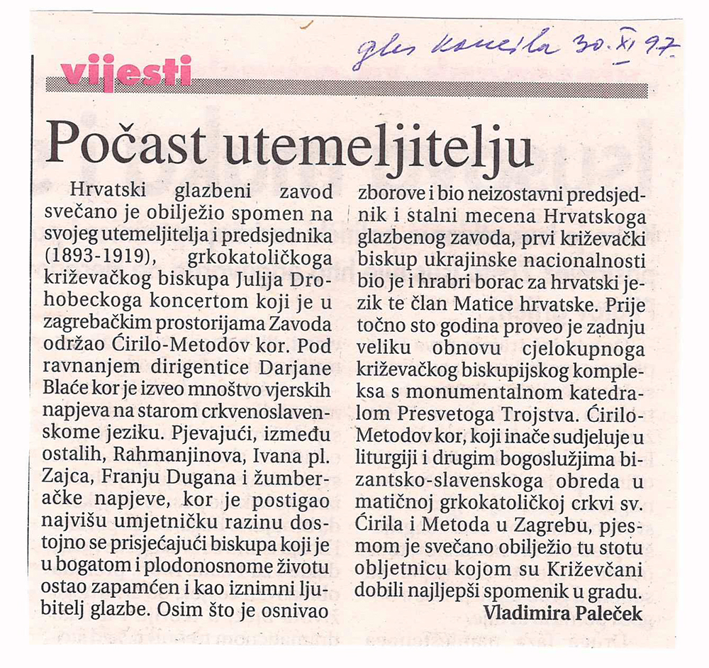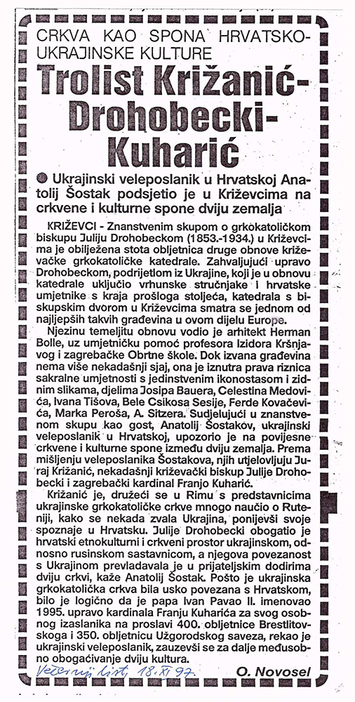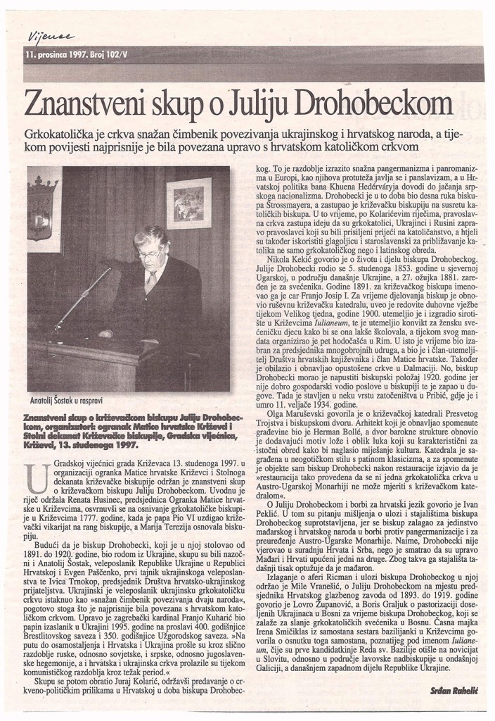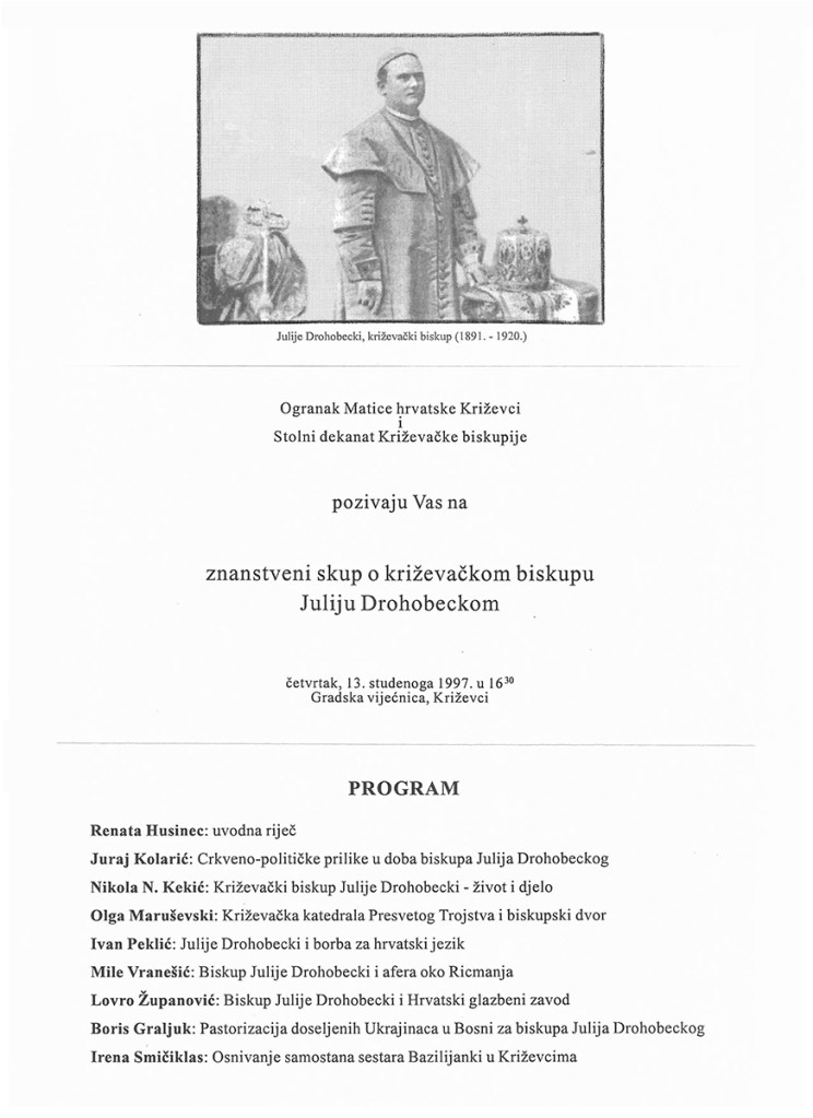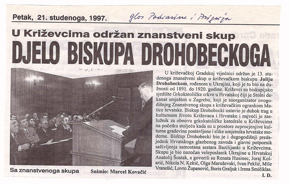 U križevačkoj je Gradskoj vijećnici, u organizaciji domaćeg ogranka Matice hrvatske i Stolnoga dekanata križevačke biskupije, održan u četvrtak, 13. studenoga 1997., znanstveni skup o istaknutome križevačkom grkokatoličkom biskupu, čovjeku koji je, bez obzira na nebrojena učinjena dobra svojih ruku darovanih drugima, prisiljen bio povući se s biskupske dužnosti, o Juliju Drohobeckome.