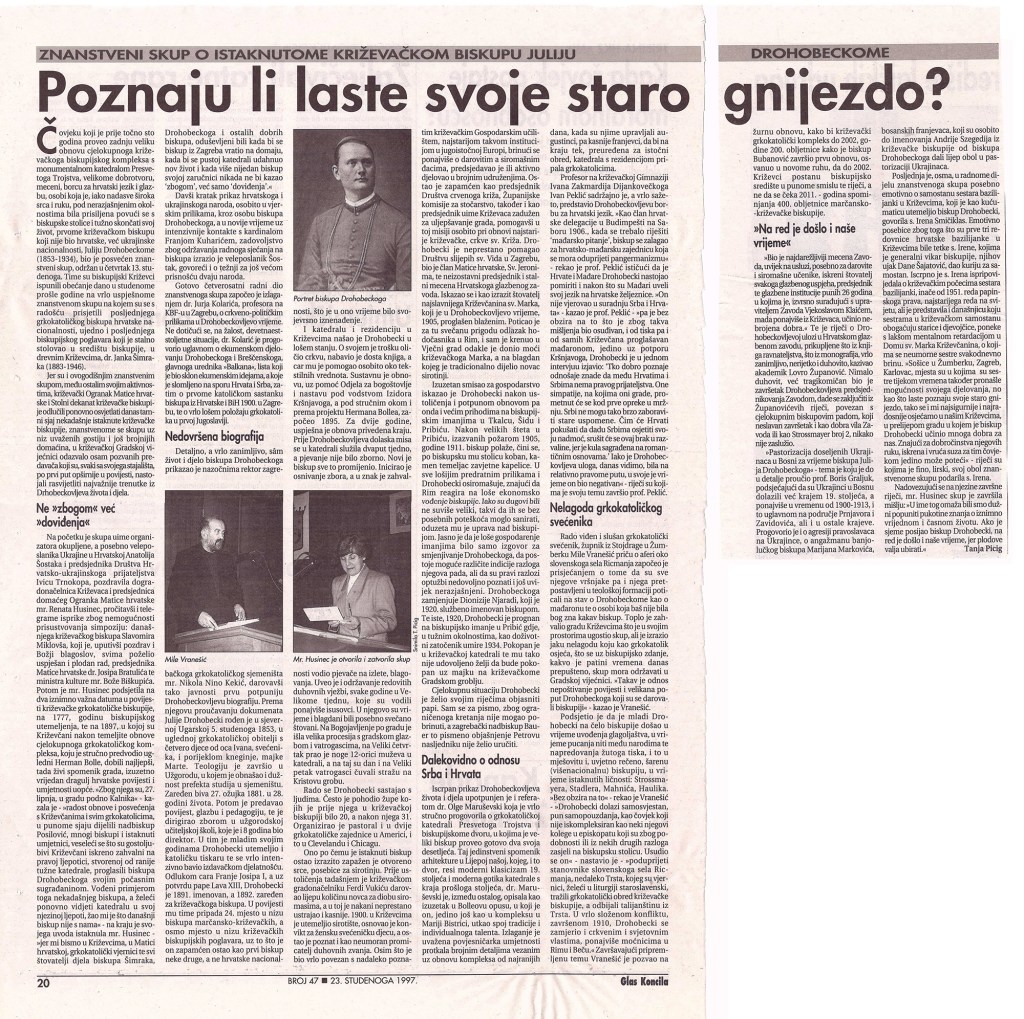 O crkveno-političkim prilikama u doba biskupova života, ali samo u 20. stoljeću, progovorio je dr. Juraj Kolarić, a o životu i djelu Drohobeckoga, do sada izuzetno slabo istraženih i poznatih, rektor Grkokatoličkoga sjemeništa u Zagrebu dr. Nikola Nino Kekić. O katedrali i biskupskom dvoru, kao o jedinstvenom spomeniku arhitekture u cijeloj lijepoj našoj ističući osobito ikonostas, skupno djelo hrvatske moderne, ali i potanko izvješćujući o obnovi koju je pod vodstvom Drohobeckoga i Izidora Kršnjavoga proveo uvaženi Herman Bolle, govorila je dr. Olga Maruševski. Profesor na križevačkoj Gimnaziji Ivana Zakmandija Dijankovečkoga Ivan Peklić sadržajno je, a sažeto prikazao stalnu biskupovu borbu za hrvatski jezik. Drohobecki je bio uvjeren da je političko sporazumijevanje s Mađarima moguće, a svaka zajednička politika sa Srbima da je naivna i kobna. Župnik žumberačke grkokatoličke Stojdrage Mile Vranešić iscrpno je protumačio spor i sukob oko slovenskoga sela Ricmanja, nedaleko Trsta. Stanovnici toga sela težeći u bogoslužju za staroslavenskim jezikom, odbijali su talijanštinu tršćanske biskupije, te su se htjeli zaštititi priključenjem križevačkoj biskupiji. Podupirući njihov zahtjev Drohobecki je stekao moćne neprijatelje u Beču i u Rimu. O Drohobeckome kao o dugogodišnjem predsjedniku i najvećem meceni Hrvatskoga glazbenog zavoda, o njegovu usponu i žalosnom kraju, navodno zbog financijskog neuspjeha, zanimljivo je pripovijedao akademik Lovro Županović. O biskupovom zauzimanju za dušobrižništvo doseljenih Ukrajinaca u Bosnu govorio je prof. Boris Graljuk.