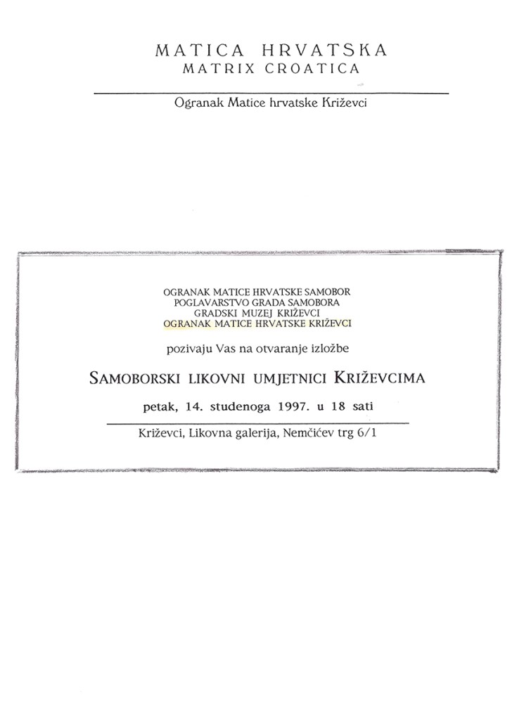 Nekadašnje slobodne kraljevske gradove, Križevce i Samobor, odlučili su povezati umjetnici. Samoborski slikari, keramičari i kipari, akademci, primijenjeni umjetnici, amateri, zajedno s Likovnom radionicom učenika Osnovne škole »Bogumil Toni«, otvorili su u Gradskoj galeriji u Križevcima svoju zajedničku izložbu. Oni se predstavljaju sa 40-ak svojih radova, skupnim radom – zastavom grada Samobora i zastavom Ogranka Matice hrvatske. IzIožbu su priredili ogranci Matice hrvatske dvaju gradova uz pomoć križevačkog Gradskog muzeja.
