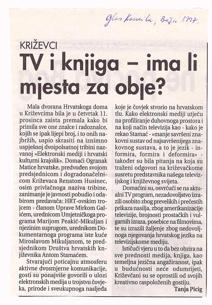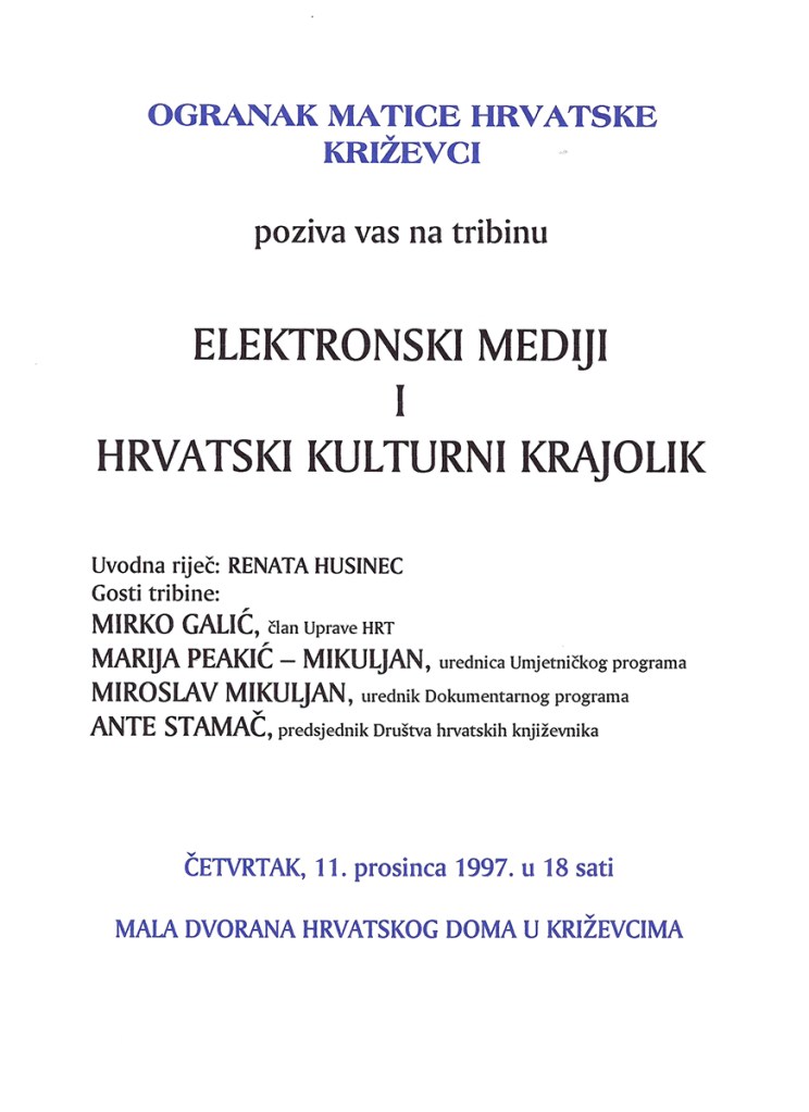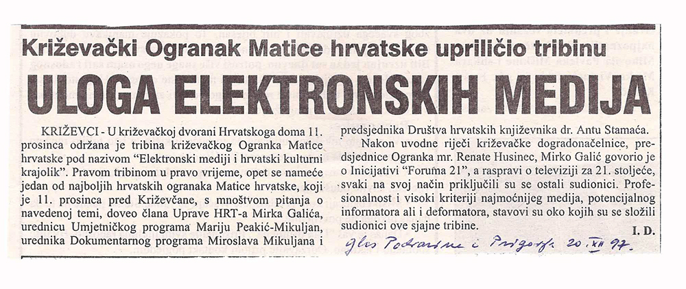 Elektronski mediji i hrvatski kulturni krajolik tema je tribine koja je 11. prosinca 1997. održana u Križevcima u maloj dvorani Hrvatskog doma na kojoj su govorili gosti s Hrvatske radiotelevizije i pokušali prisutnima predočiti što je to Televizija danas i kakva bi po njihovim mišljenjima trebala biti. Organizator vrlo uspjele tribine koja je potrajala dva i po sata i na kojoj je od posjetitelja bilo puno pitanja za goste, bio je križevački Ogranak Matice hrvatske.