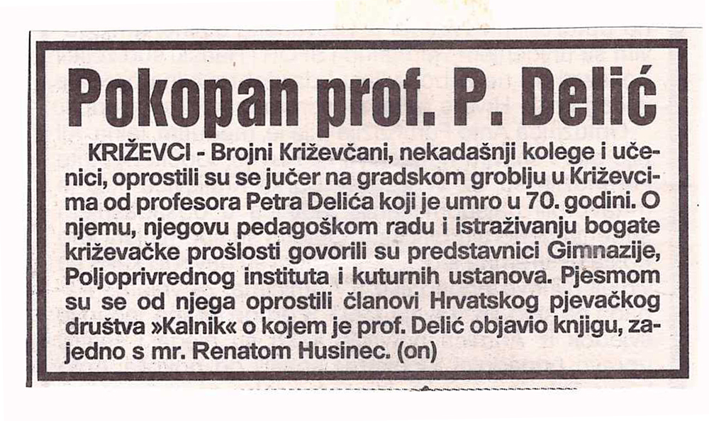 U ovom bolnom susretu s njim, posljednjem, teška mi je ali neminovna i časna dužnost da se u ime Poljoprivrednog instituta u Križevcima i Ogranka Matice hrvatske od njega oprostim u počast njegovu životu i zahvalnost njegovu djelu. U Poljoprivrednom institutu kao i u Matici hrvatskoj mjesto Petra Delića zauvijek će ostati nepopunjeno, kao jedno od najčasnijih mjesta.