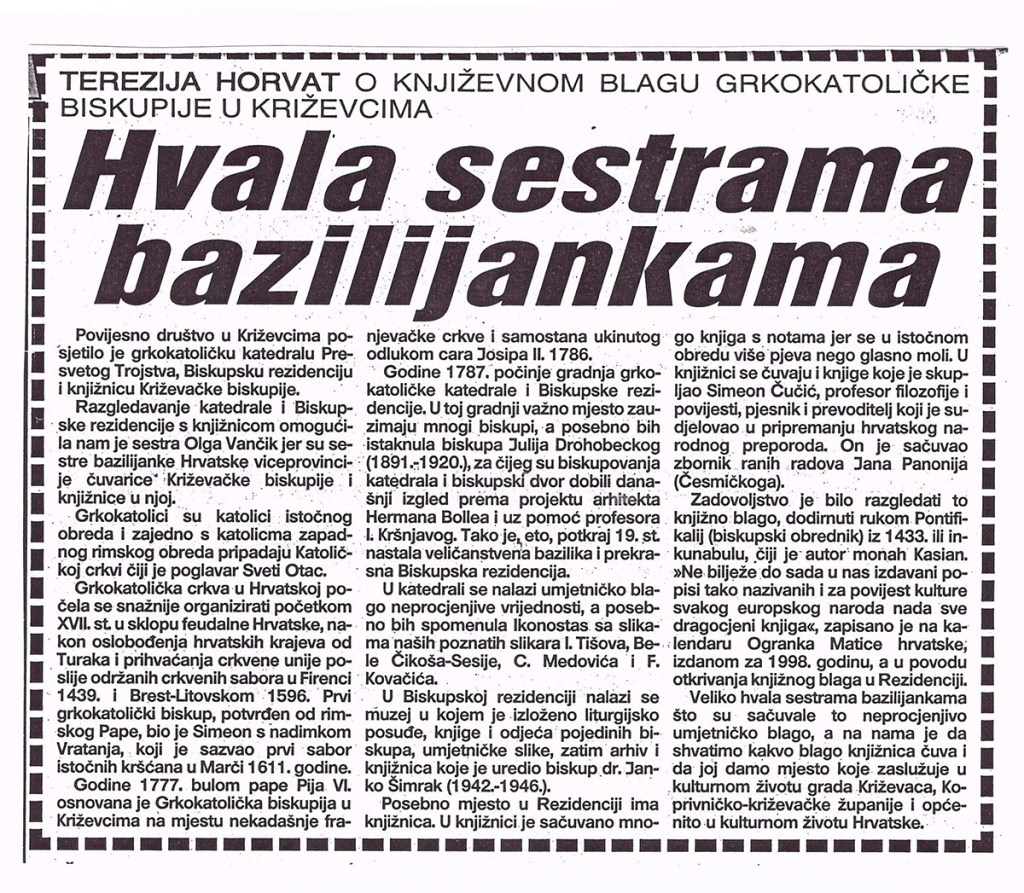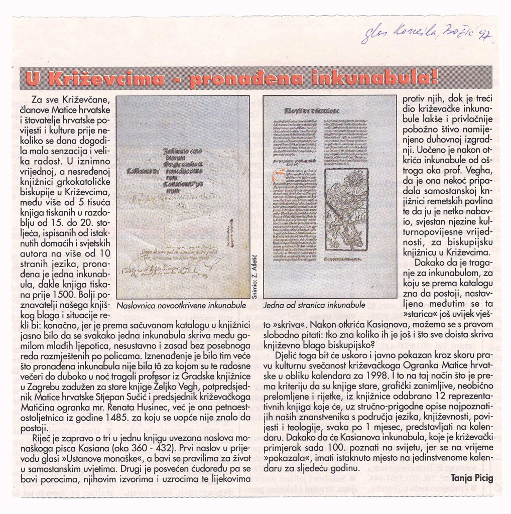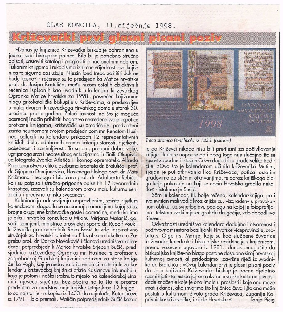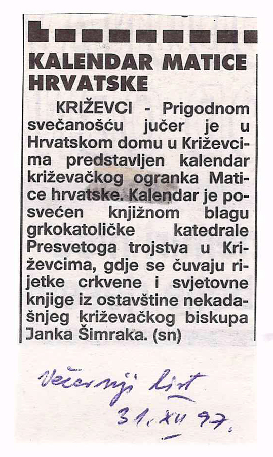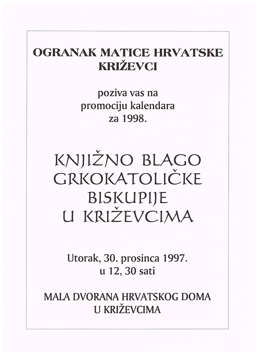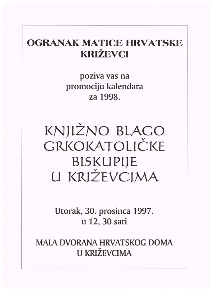 Ogranak Matice hrvatske Križevci predstavio je 30. prosinca 1997. u maloj dvorani Hrvatskoga doma kalendar za 1998. s temom Knjižno blago grkokatoličke biskupije u Križevcima. Okupljene su pozdravili Renata Husinec, predsjednica Ogranka MH Križevci i križevački gradonačelnik Roko Bašić. O kalendaru su govorili Stjepan Sučić, potpredsjednik Matice hrvatske, Darko Novaković s Filozofskoga fakulteta u Zagrebu, Željko Vegh iz Gradske knjižnice Zagreb.