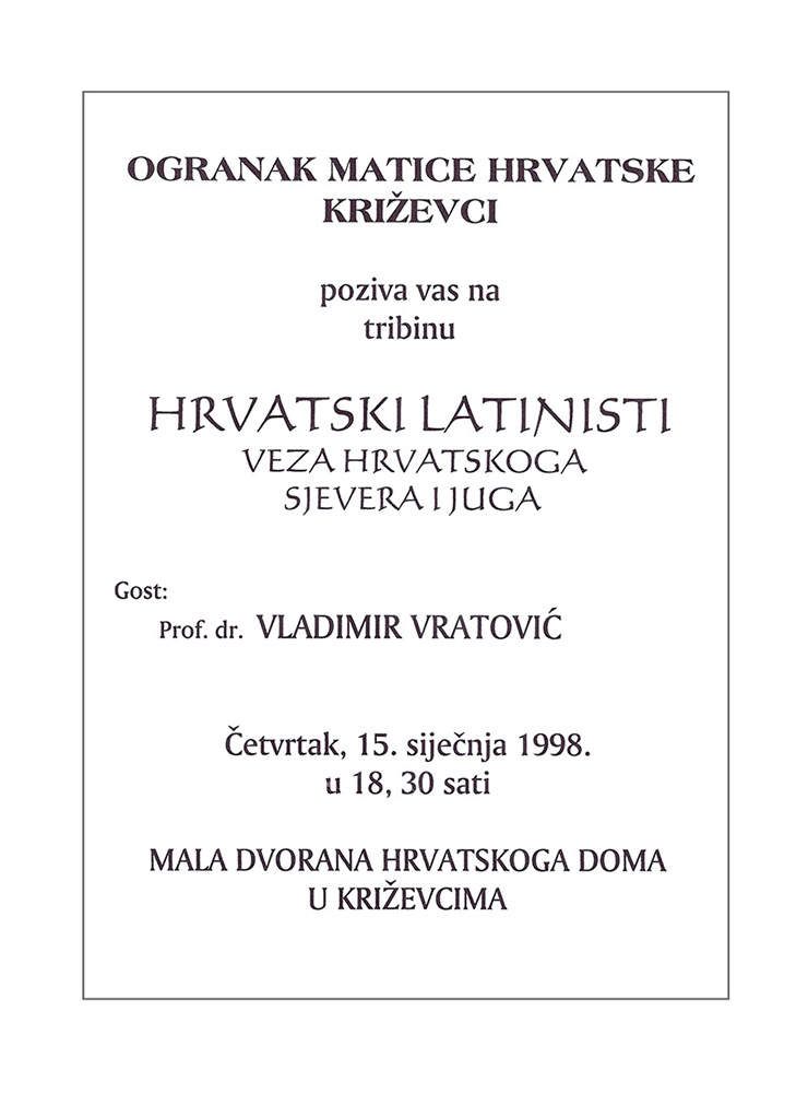 1998. / Tribine / okrugli stolovi Tribina „Hrvatski latinisti – veza hrvatskoga sjevera i juga” 15/01/199807/01/2021 martinarebic Ogranak MH Križevci organizirao je 15. siječnja 1998. u maloj dvorani Hrvatskoga doma tribinu pod nazivom „Hrvatski latinisti – veza hrvatskoga sjevera i juga”. Gost je tribine bio prof. dr. Vladimir Vratović. Podjeli ovo: Click to share on X(Otvara se u novom prozoru) X Klikom podijelite na Facebooku(Otvara se u novom prozoru) Facebook Lajk Učitavanje...