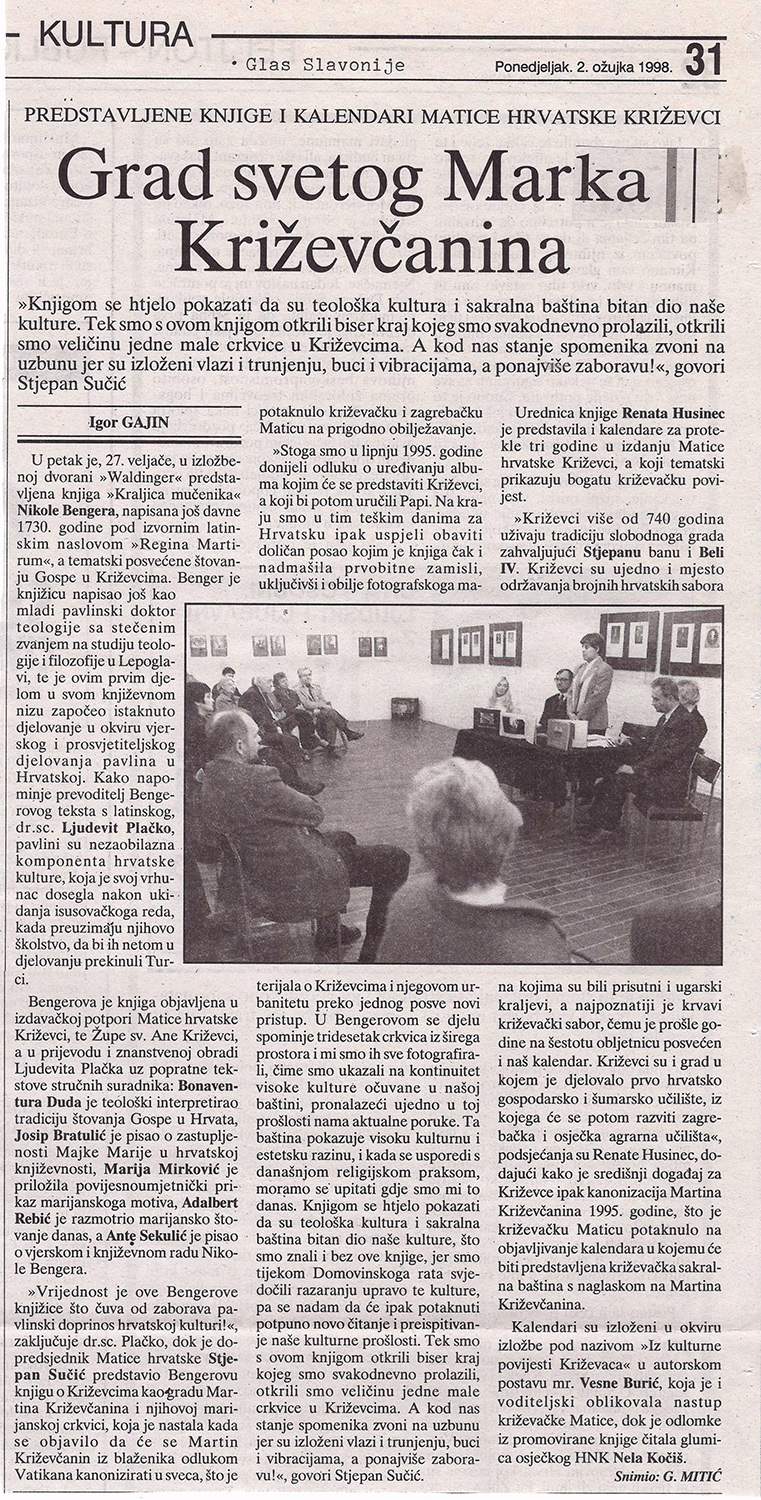 Matica hrvatske Osijek, Matica hrvatska Križevci i Matica hrvatska Zagreb priredile su izložbu kalendara, knjiga, fotografija „Iz kulturne povijesti Križevaca”. Izložba je od 25. veljače do 1. ožujka 1998. postavljena u Izložbenoj dvorani „Waldinger”. Uz izložbu je u petak 27. veljače predstavljena knjiga Nikole Bengera „Kraljica mučenika”. O knjizi su govorili: prevoditelj dr. sc. Ljudevit Plačko, predsjednica MH Križevci Renata Husinec, dr. sc. Mate Križman, kustosica izložbe mr. sc. Vesna Burić i potpredsjednik MH Stjepan Sučić. Ulomke iz knjige čitala je Kornelija Kočiš, glumica HNK Osijek.