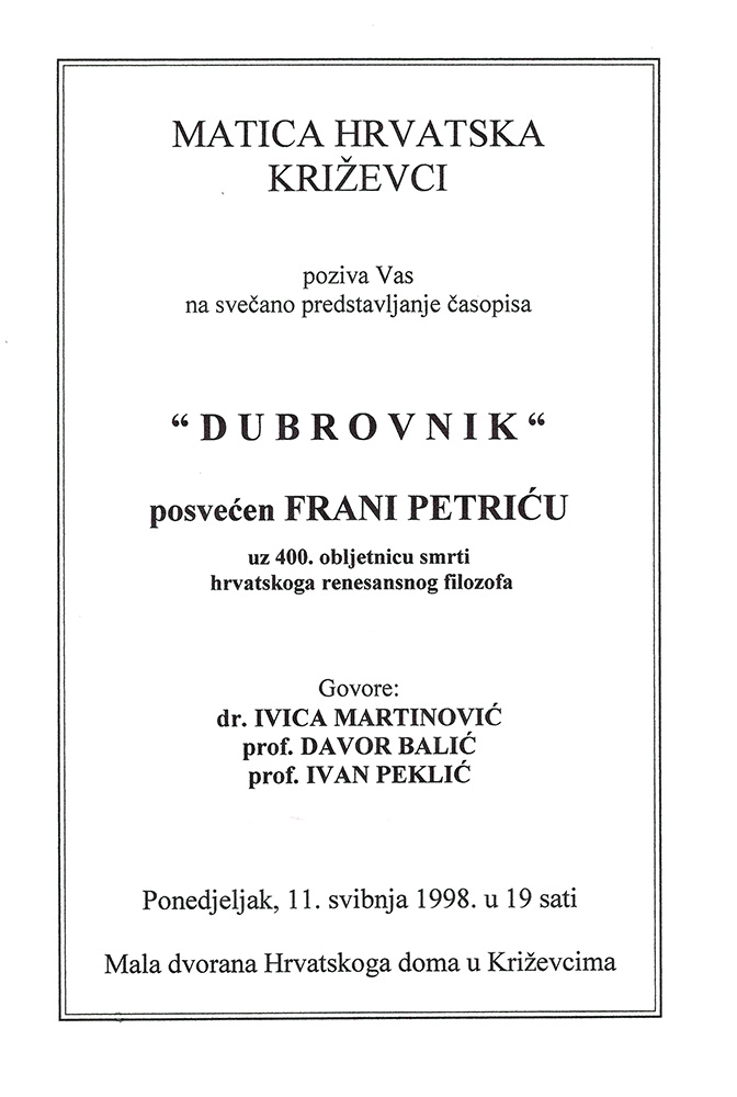 U ponedjeljak 11. svibnja 1998. održano je u maloj dvorani Hrvatskoga doma predstavljanje časopisa „Dubrovnik” uz 400. obljetnicu smrti hrvatskoga renesansnog filozofa Frane Petrića. Govorili su dr. sc. Ivica Martinović, Davor Balić, prof. i Ivan Peklić, prof.