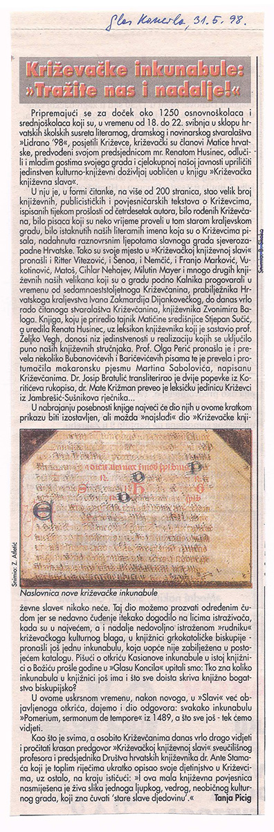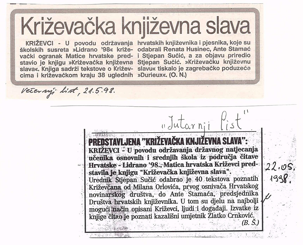 U Križevcima je od 18. do 22. svibnja 1998. održana državna smotra Lidrano. Ogranak MH Križevci tom je prigodom objavio knjigu „Križevačka književna slava”, u koju je u formi čitanka, na više od 200 stranica, skupljen velik broj književnih, publicističkih i povijesnih tekstova o Križevcima. Knjigu su 19. svibnja u Hotelu „Kalnik” predstavili Željko Vegh, prof., prof. dr. Olja Perić, prof. dr. Mate Križman, prof. dr. Ante Stamać, književnik Zvonimir Balog, Stjepan Sučić i Renata Husinec.