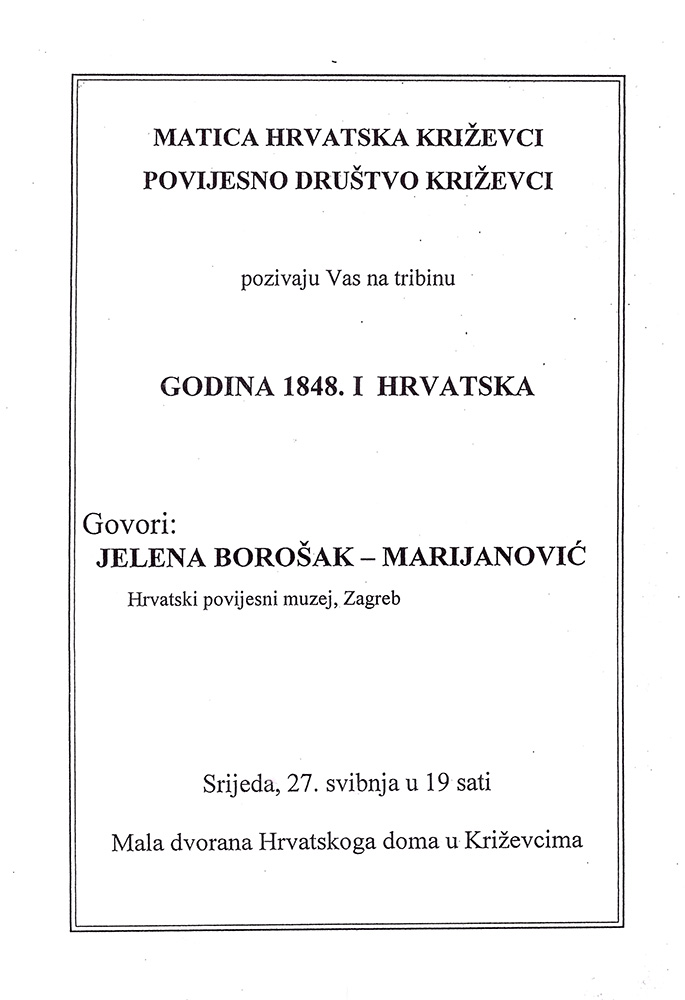 1998. / Tribine / okrugli stolovi Tribina „Godina 1848. i Hrvatska” 27/05/199824/01/2021 martinarebic Matica hrvatska Križevci i Povijesno društvo Križevci organizirali su 27. svibnja 1998. u maloj dvorani Hrvatskoga doma tribinu „Godina 1848. i Hrvatska”. Gošća tribine bila je Jelena Borošak-Marijanović iz Hrvatskoga povijesnog muzeja u Zagrebu. Podjeli ovo: Share on X(Otvara se u novom prozoru) X Podijeli na Facebooku (Otvara se u novom prozoru) Facebook Lajk Učitavanje...