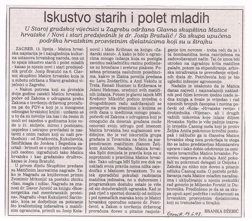 U staroj gradskoj vijećnici u Zagrebu održana je 13. lipnja 1998. šesta glavna skupština Matice hrvatske. Tom su prigodom dodijeljene nagrade i povelje istaknutim pojedincima i izdanjima. Tako je zlatnu povelju za pojedinačni doprinos Matici dobila Renata Husinec, predsjednica Ogranka MH Križevci. Također, križevački je ogranak nagrađen i dvjema brončanim poveljama za dva izdanja: „Križevačku književnu slavu” i „Kraljicu mučenika” Nikole Bengera.
