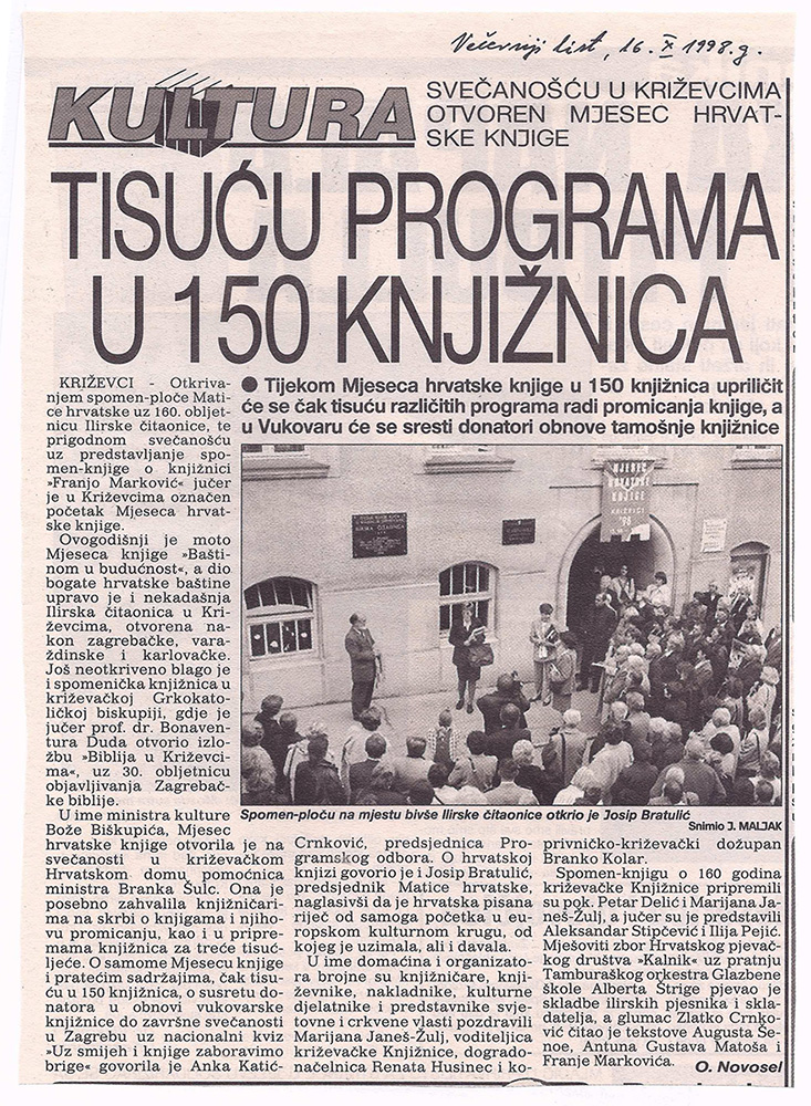 U sklopu svečanosti otvorena je obnovljena zgrada nekadašnje Ilirske čitaonice te je na njoj otkrivena spomen-ploča. U velikoj dvorani Hrvatskoga doma o hrvatskoj su knjizi govorili ministar Božo Biškupić i predsjednik MH prof. dr. Josip Bratulić, dok su prof. dr. Aleksandar Stipčević i prof. Ilija Pejić predstavili spomen-knjigu „Gradska knjižnica ‘Franjo Marković’ 1838. – 1998.”. Prigodni kulturno-umjetnički program izveo je mješoviti zbor Hrvatskog pjevačkog društva „Kalnik” i tamburaški orkestar GŠ Alberta Štrige. Poznati zagrebački glumac Zlatko Crnković govorio je stihove ilirskih književnika.