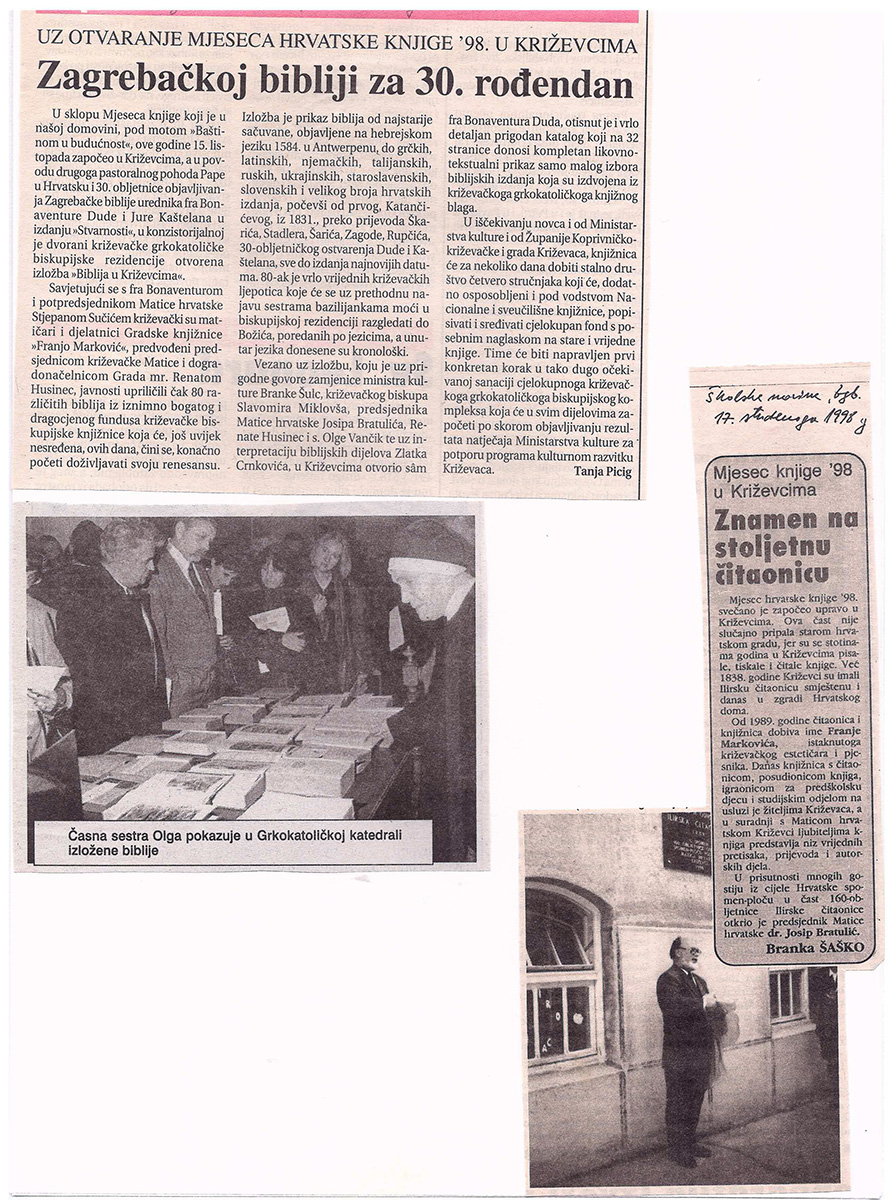 U spomeničkoj knjižnici grkokatoličke katedrale uslijedilo je otvaranje izložbe „Biblija u Križevcima” čime se proslavila 30. obljetnica objavljivanja Biblije u Zagrebu. Izložbu je otvorio prof. dr. Bonaventura Duda.