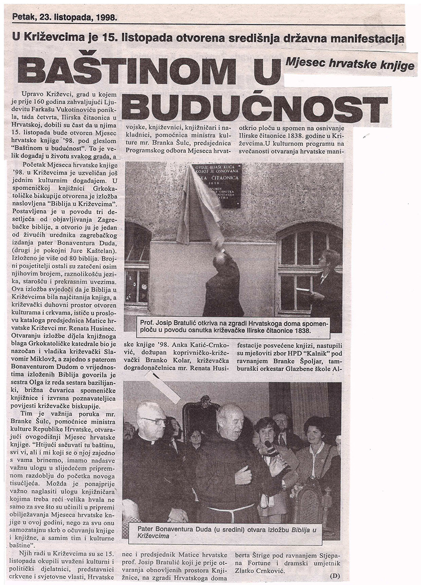 U Križevcima je 15. listopada 1998. svečano obilježen Mjesec hrvatske knjige i 160. obljetnica Gradske knjižnice „Franjo Marković” pod motom „Baštinom u budućnost”.